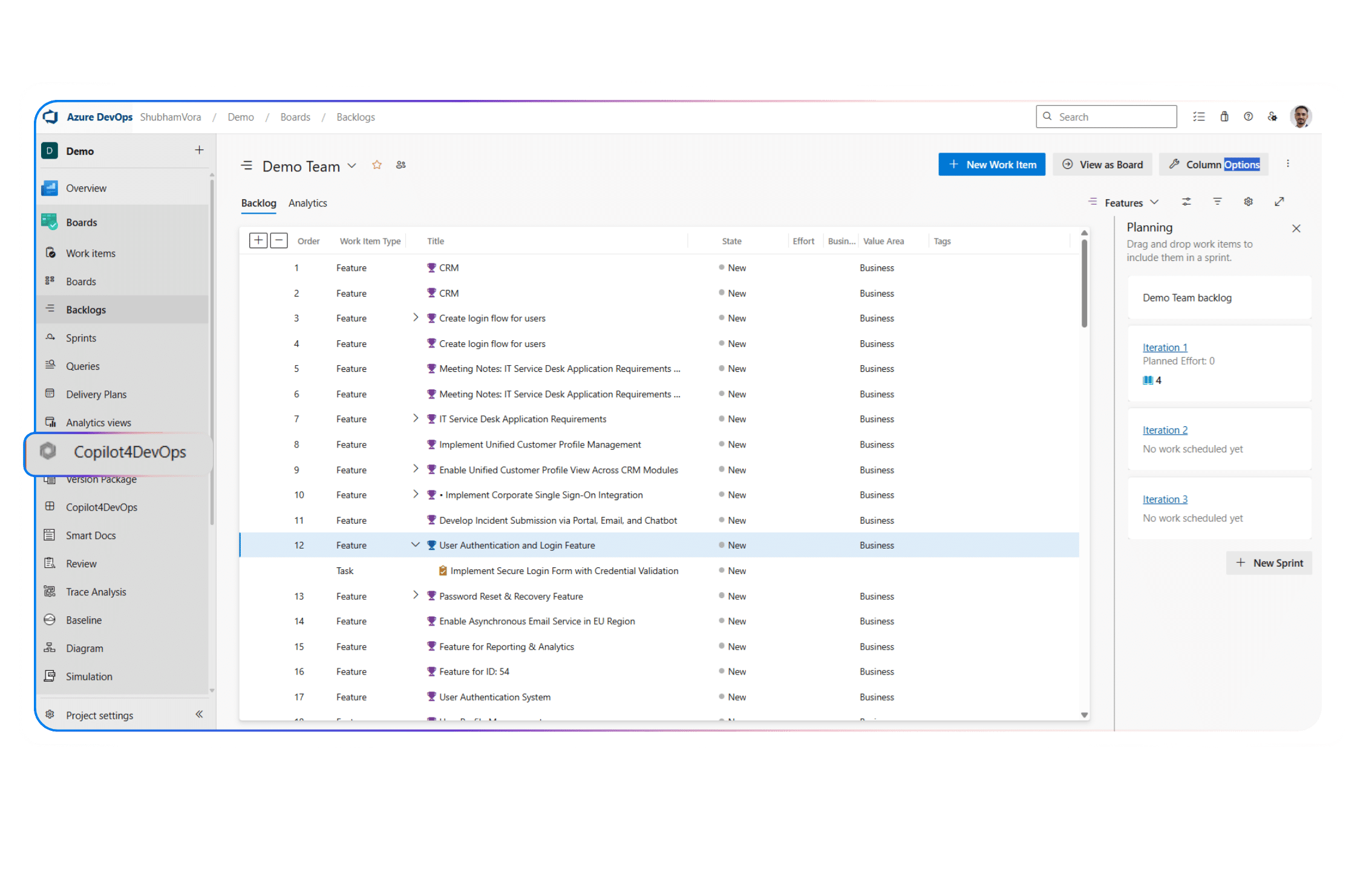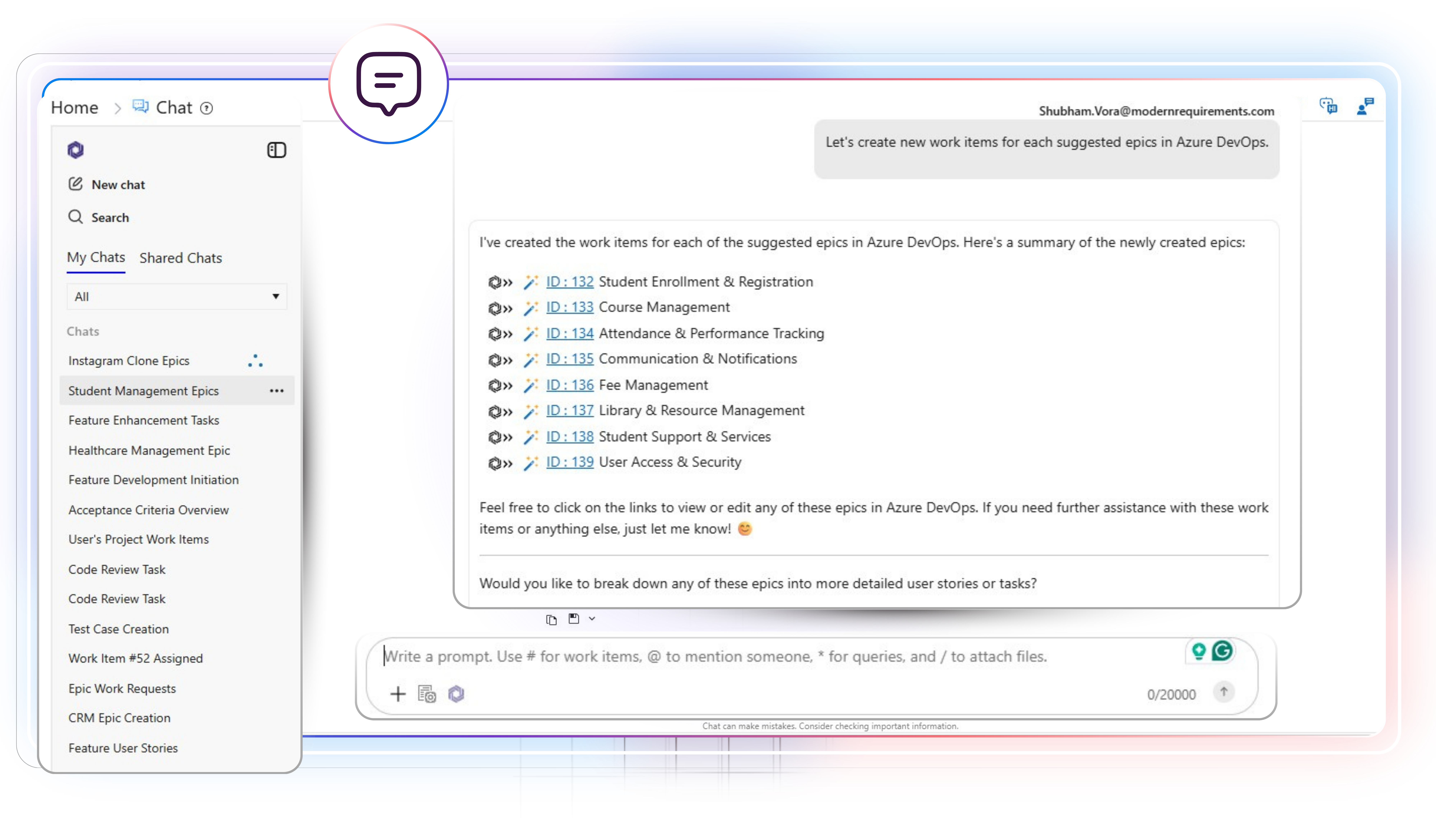- I type a single prompt like “Create five user stories for the login module” and get them added within Azure Backlog instantly.