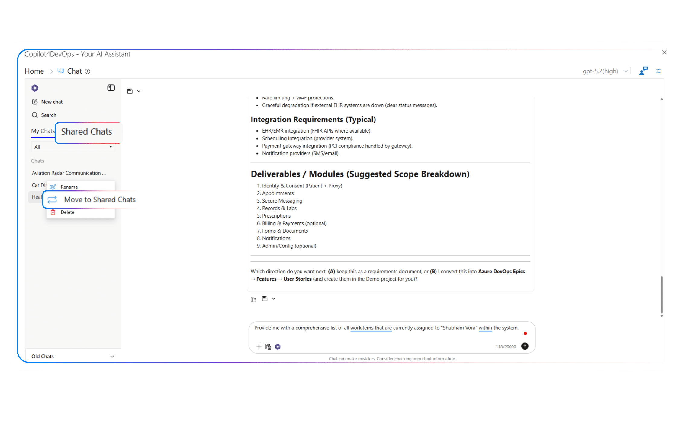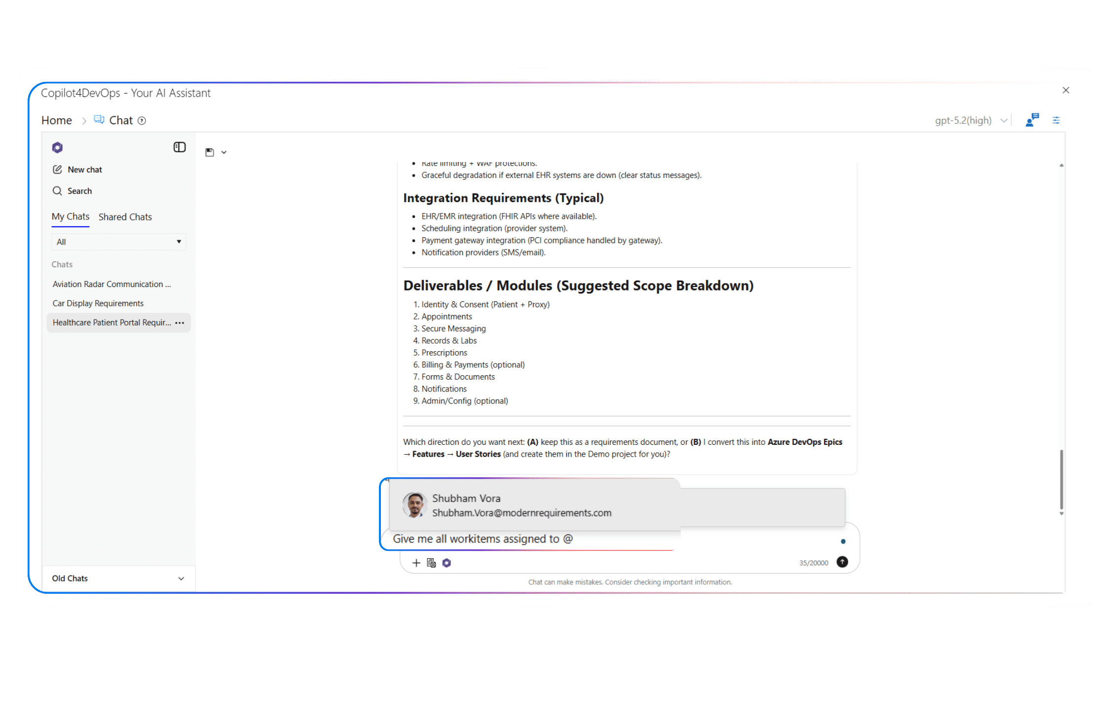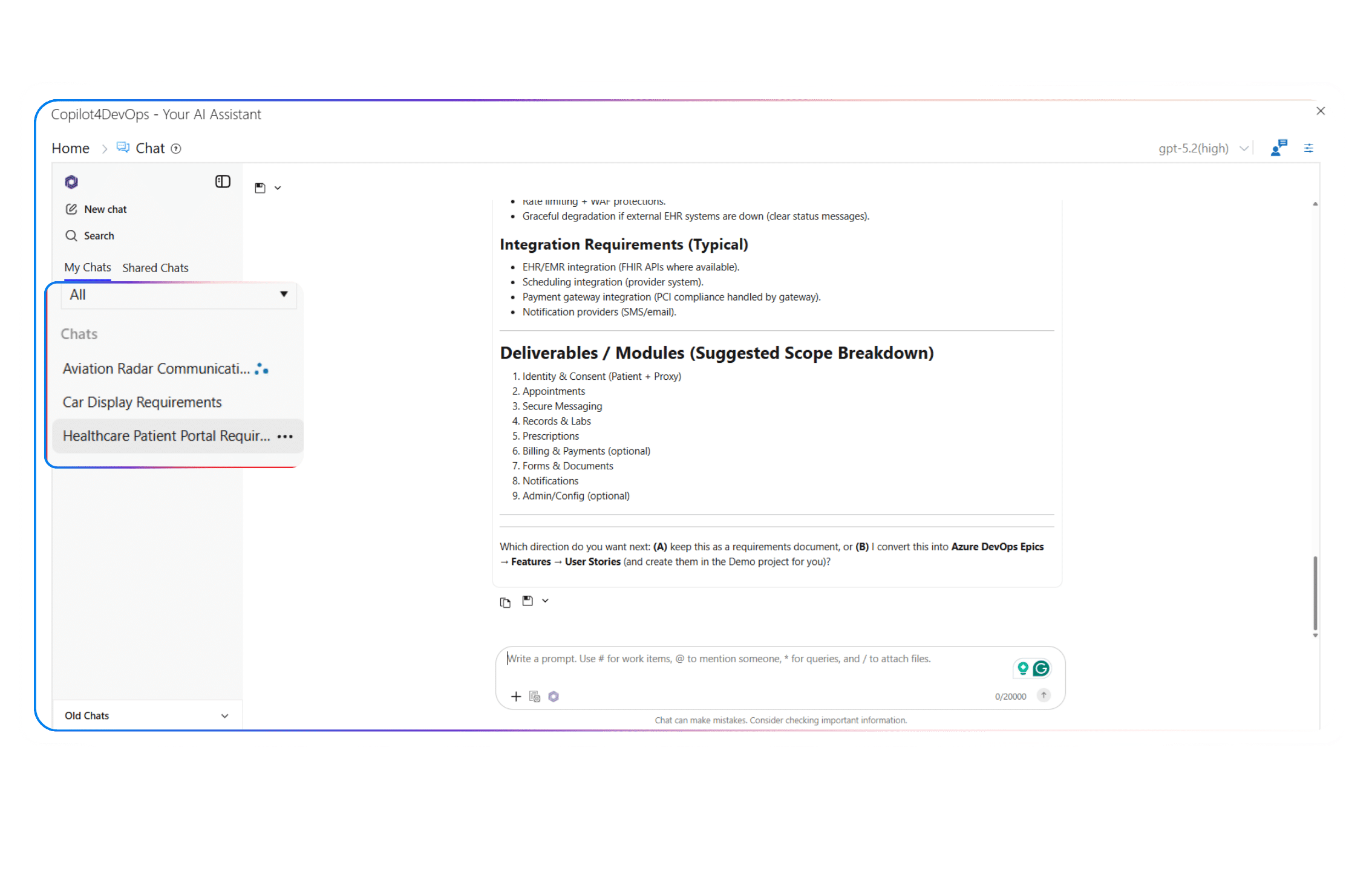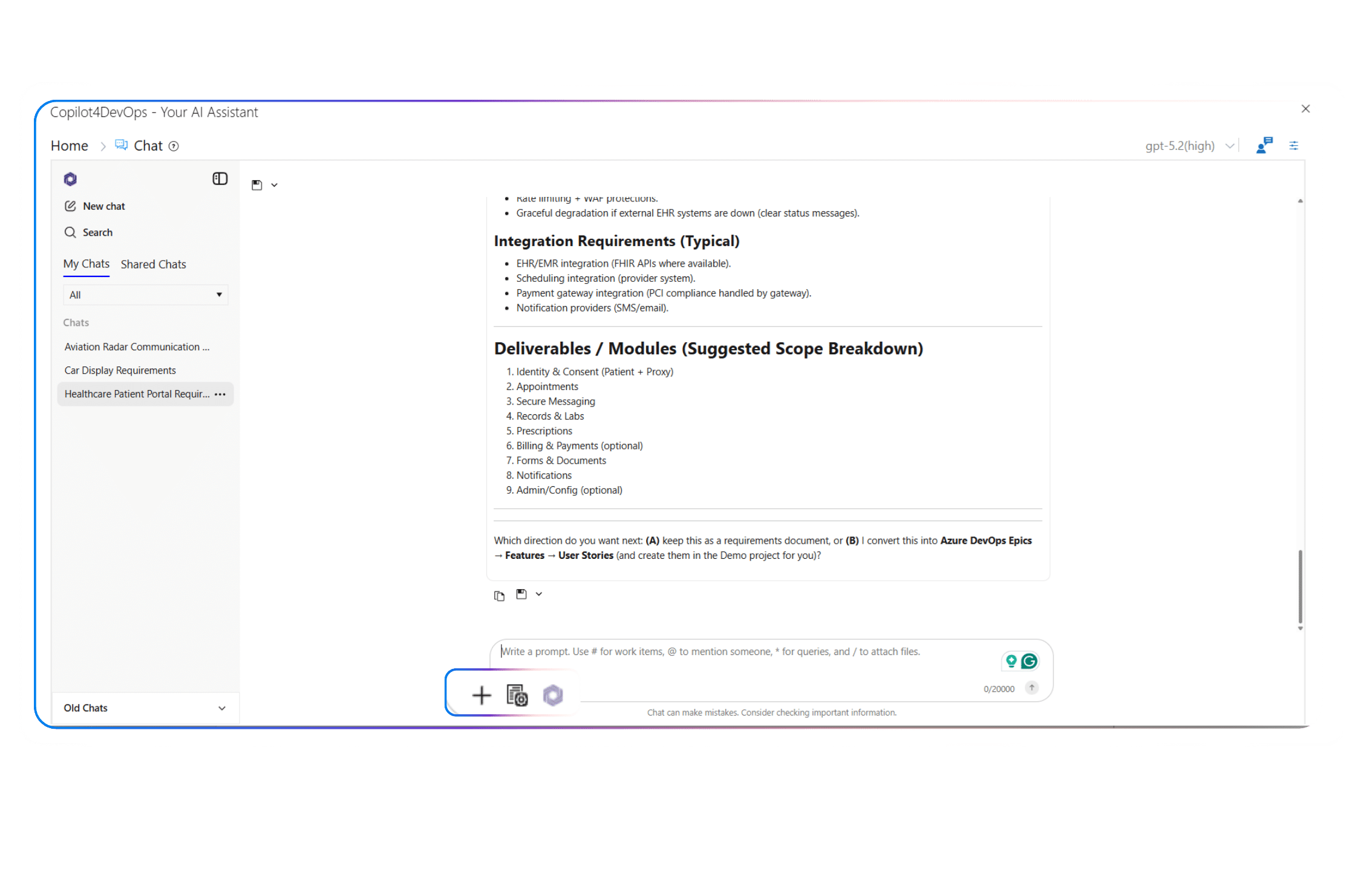 - I ask AI Chat to use particular Azure work items as a reference and prepare requirements documents accordingly.