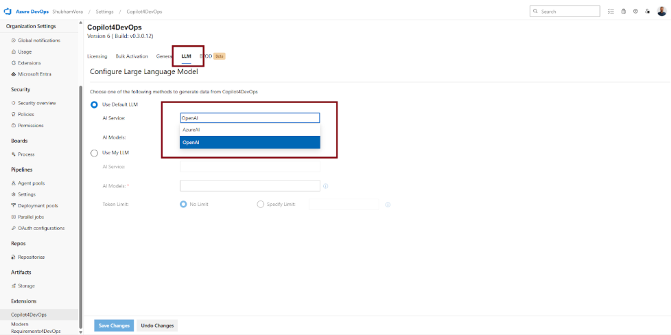 To be noted: If you are using Copilot4DevOps Lite, you won’t be able to configure your own LLM. You need to upgrade to either the Plus or the Ultimate plan.