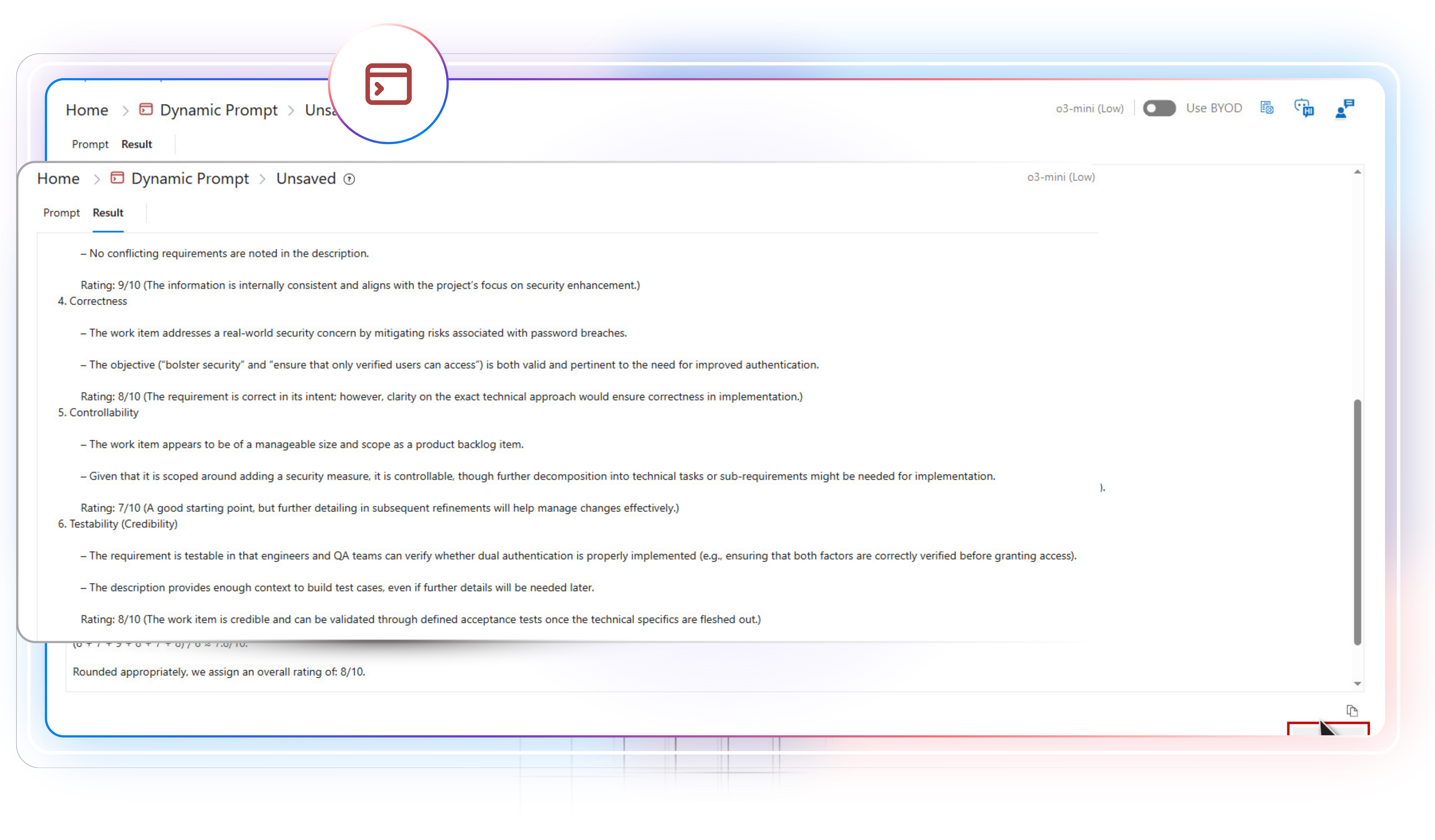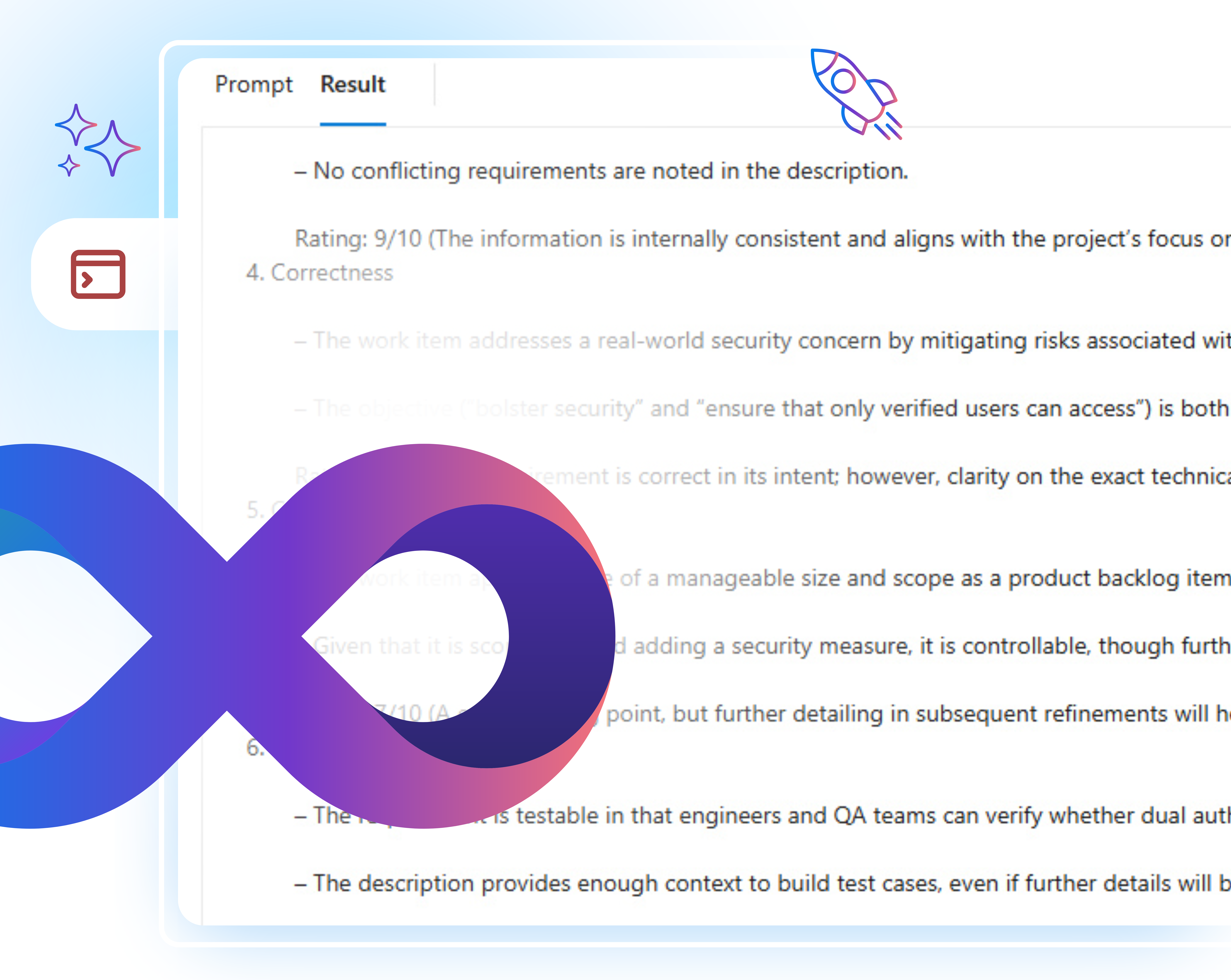 Use AI and saved prompts to repeatedly analyze the quality of requirements within Azure DevOps. Identify inconsistent and vague requirements and fix them before shipping for development.