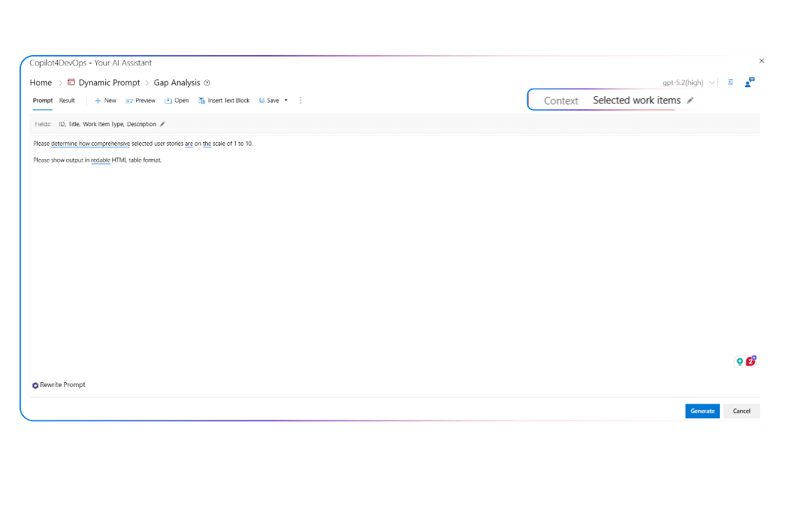 Select specific work items from the Azure backlog, add a prompt to review or analyze them, and press generate. Within a few seconds, AI generates a structured response based on the provided instructions.