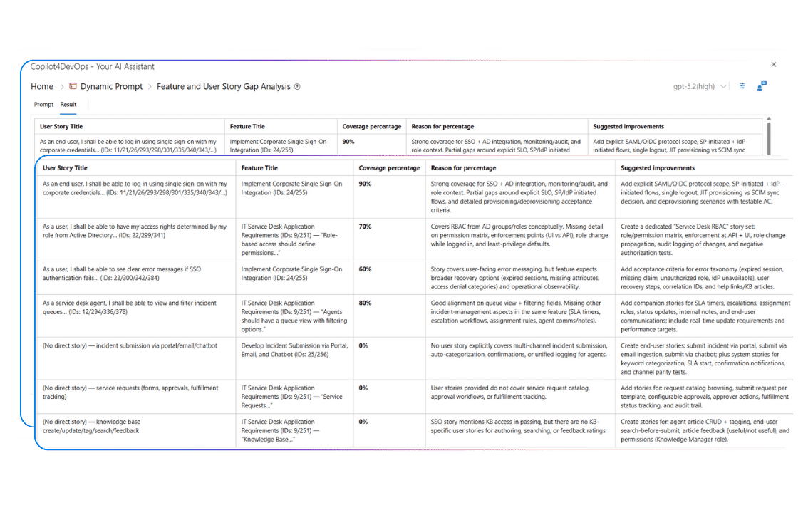 Use AI to prepare a table showing how test cases cover user stories. Identify gaps in test cases directly within Azure DevOps.