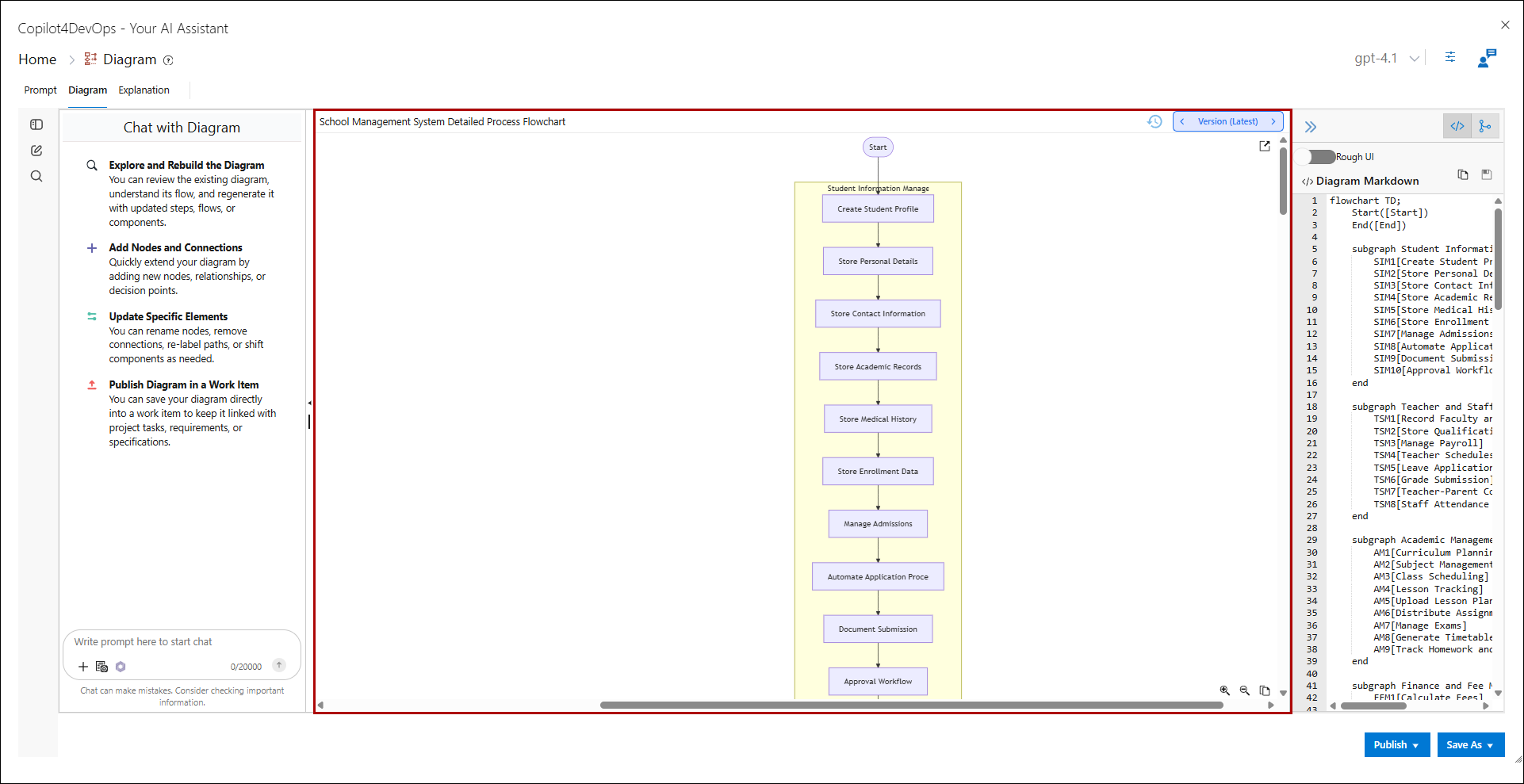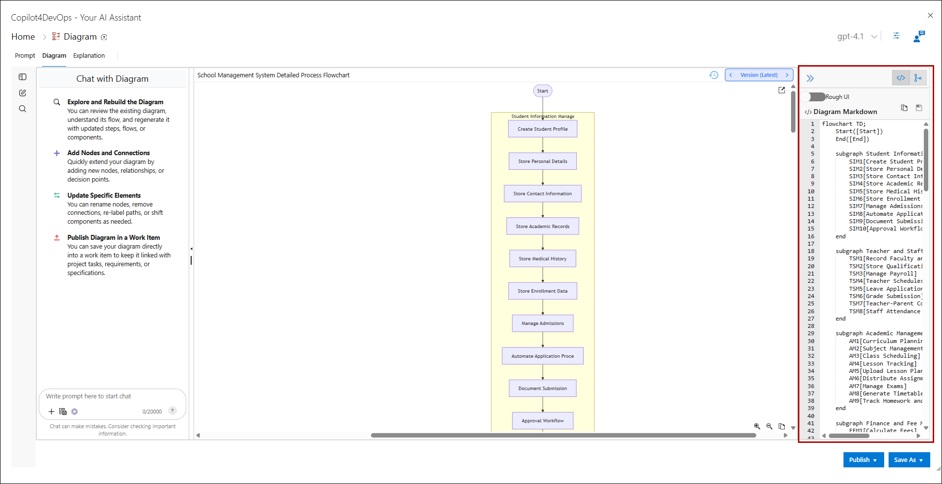 The Copilot4DevOps Diagram Feature allows users to generate, modify, and publish diagrams, including connected and sub-diagrams, thereby improving clarity and decision-making in project management. The Copilot4DevOps Diagram Feature provides a comprehensive tool set for generating, modifying, and managing diagrams within Azure DevOps. By facilitating the creation of connected and sub-diagrams, this feature enhances productivity and collaboration, enabling users to visualize complex workflows effectively.