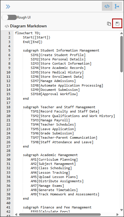 • On the right side of the Diagram tab, there is a Diagram Markdown panel. Users can use this panel to modify the diagram using the Mermaid Code.