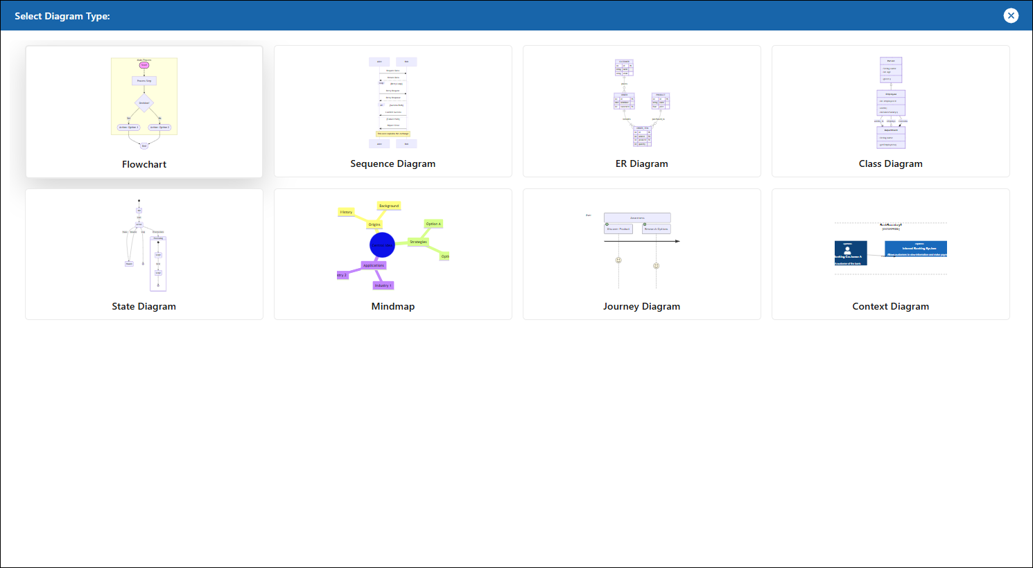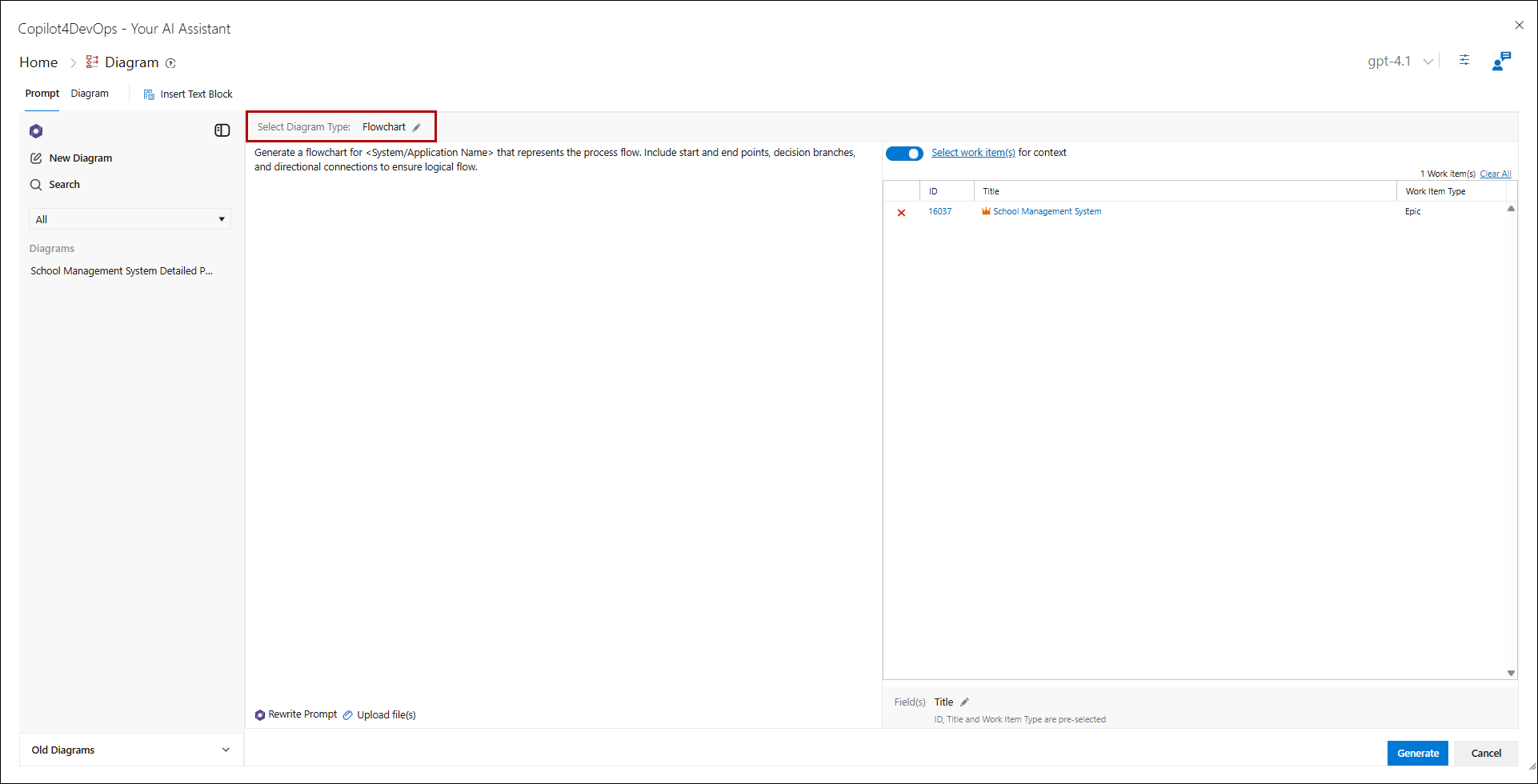 • Users can select a diagram type from the option labeled "Select Diagram Type". By default, "Flowchart" is selected, which generates diagrams based on the user's prompt or selected work item (WI) context.