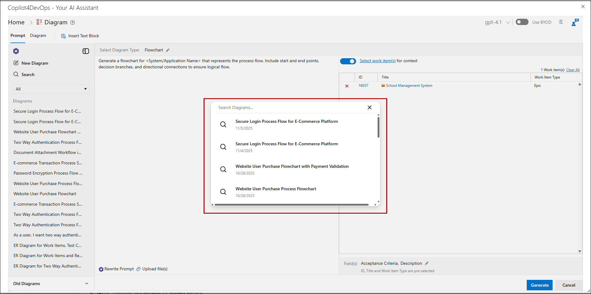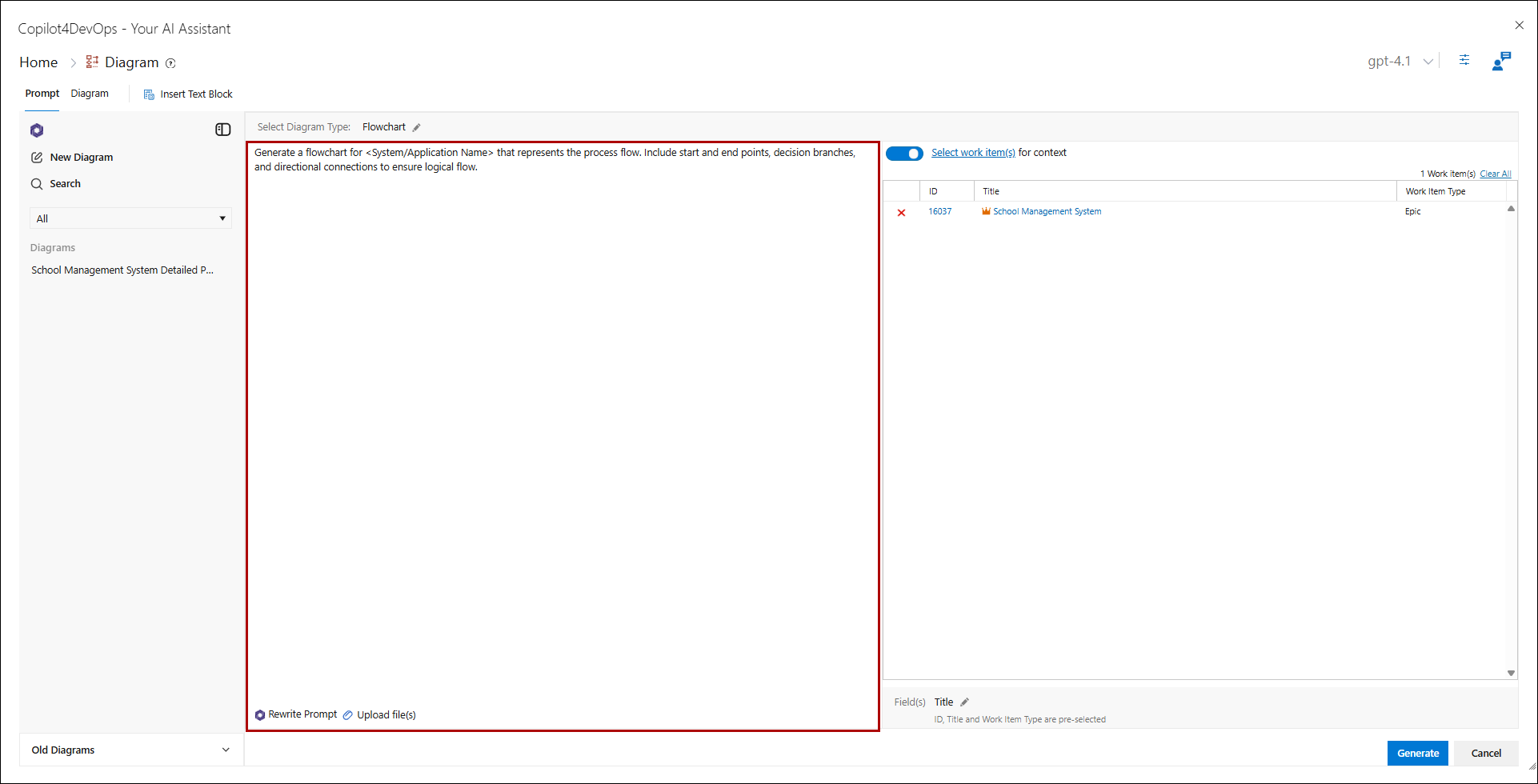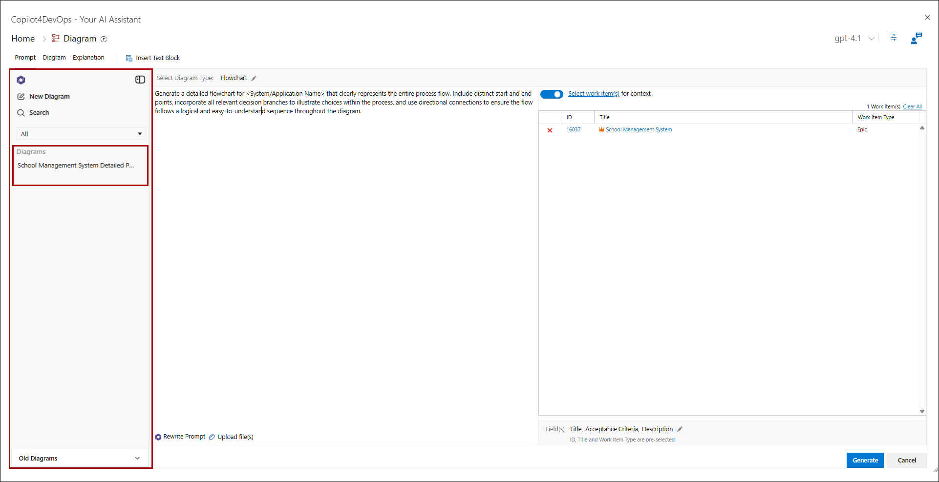 • Users can select work items for context, which will influence the generated diagram. The interface allows for selecting work items by ID or title, and users can choose specific fields to include.