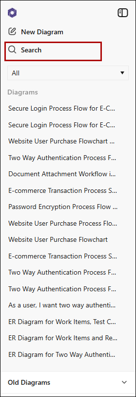 • With the search option, user can quickly search for a particular diagram. When the Search option is clicked, a Search Diagrams popup window appears.