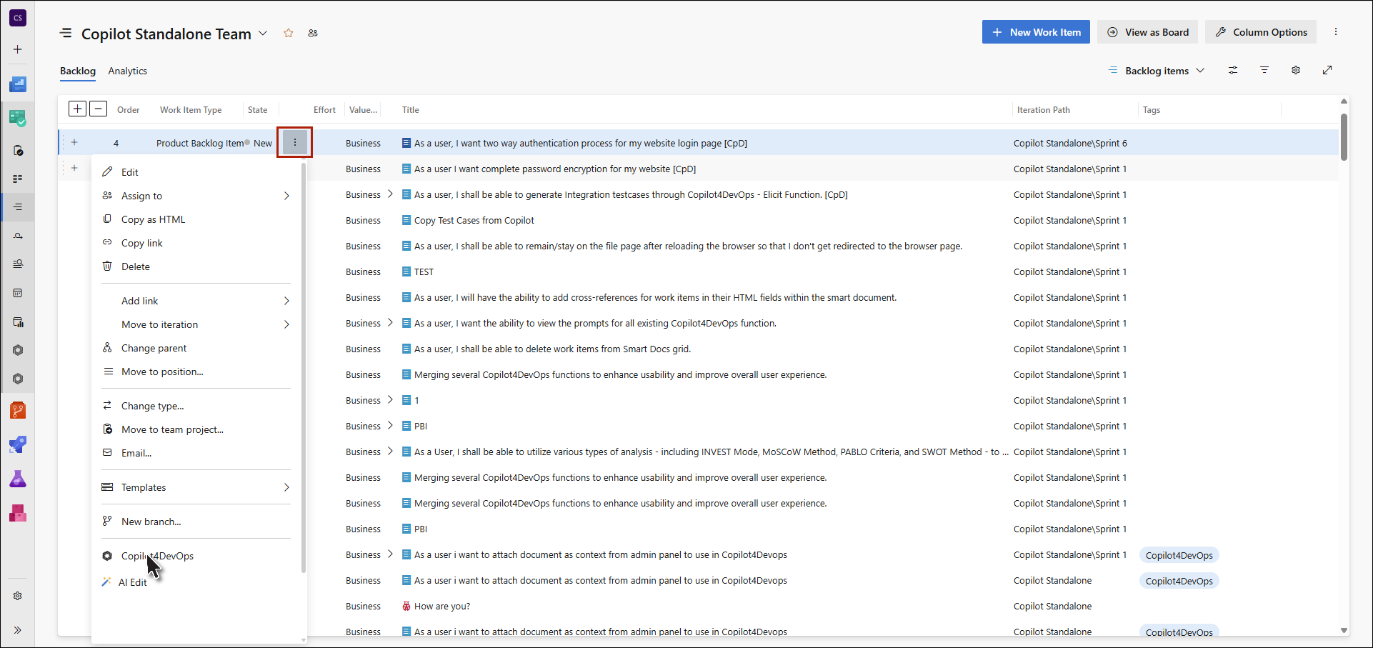 1. To access the Q&A Assistant feature in Copilot4DevOps, navigate to the context menu of any work item within either the Queries or Backlog and click on the Copilot4DevOps option.
