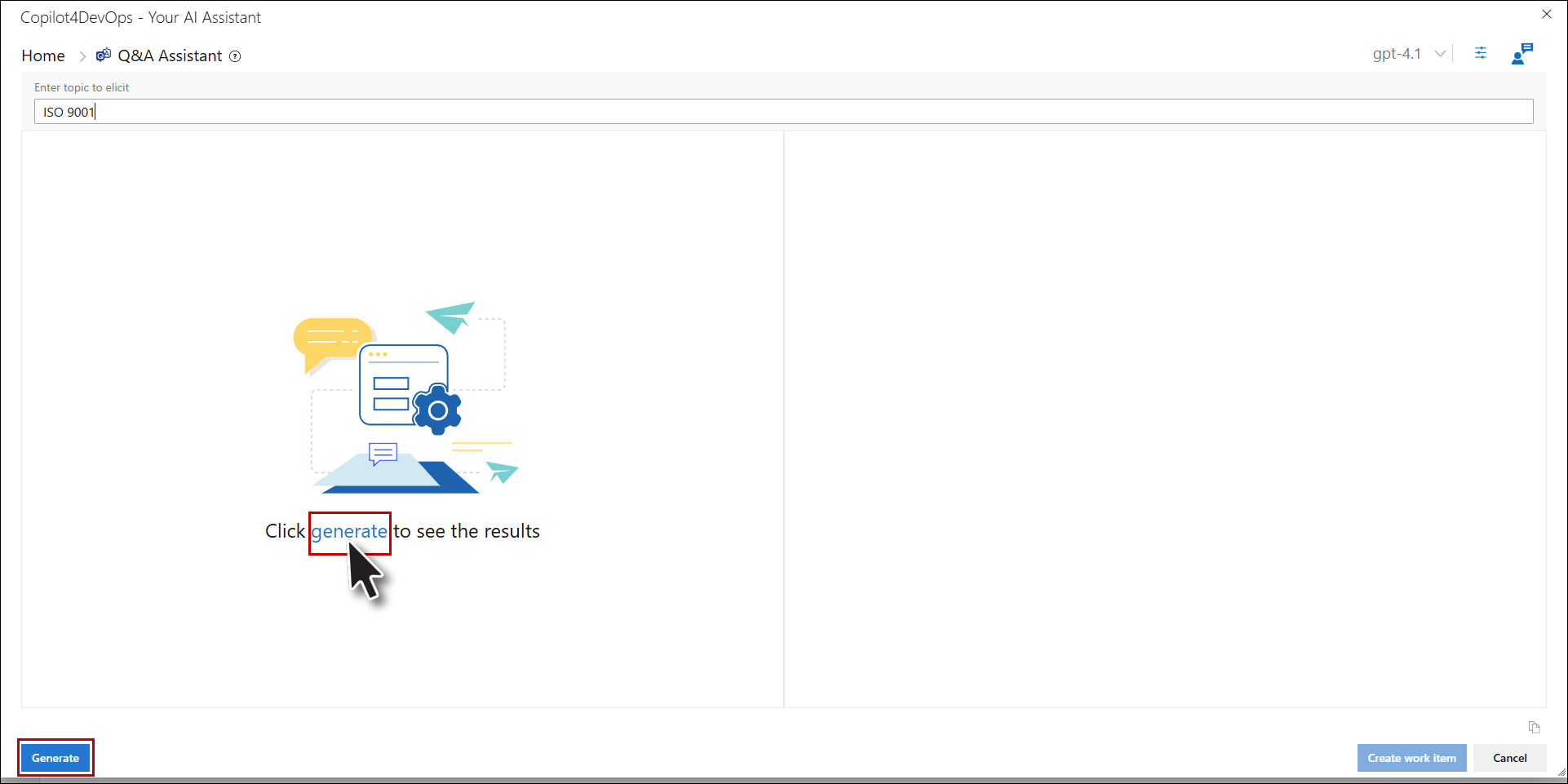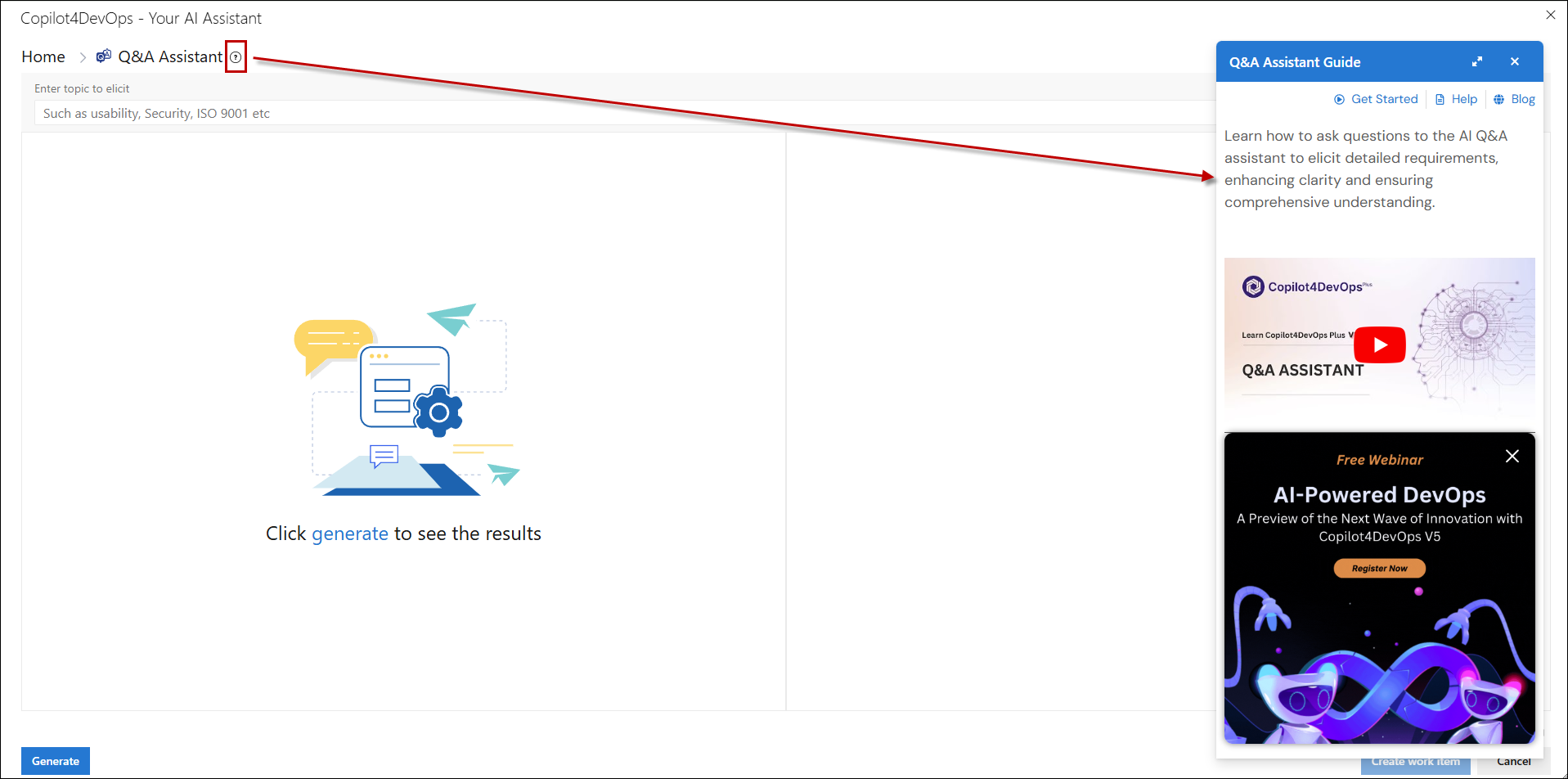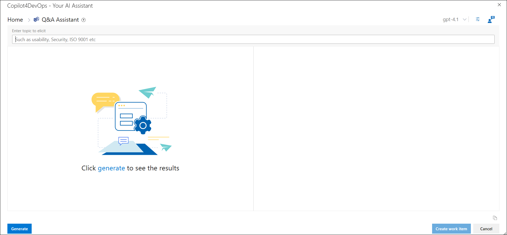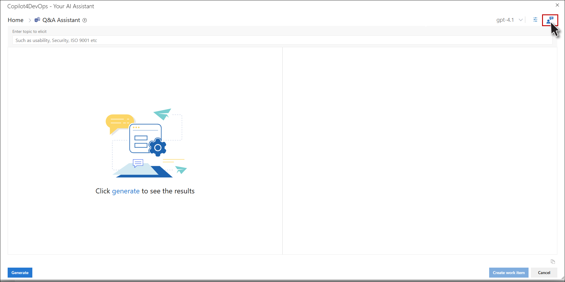 Note: This feature won't generate results based on the selected work item. Instead, you'll need to manually insert the topic to elicit and then questions related to the entered topic will be generated in the left panel.