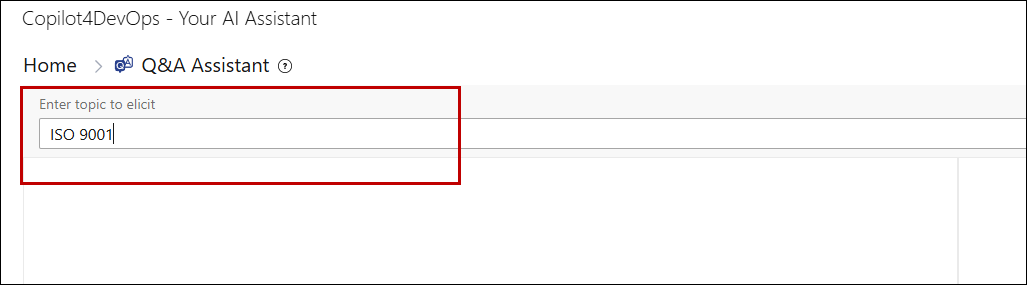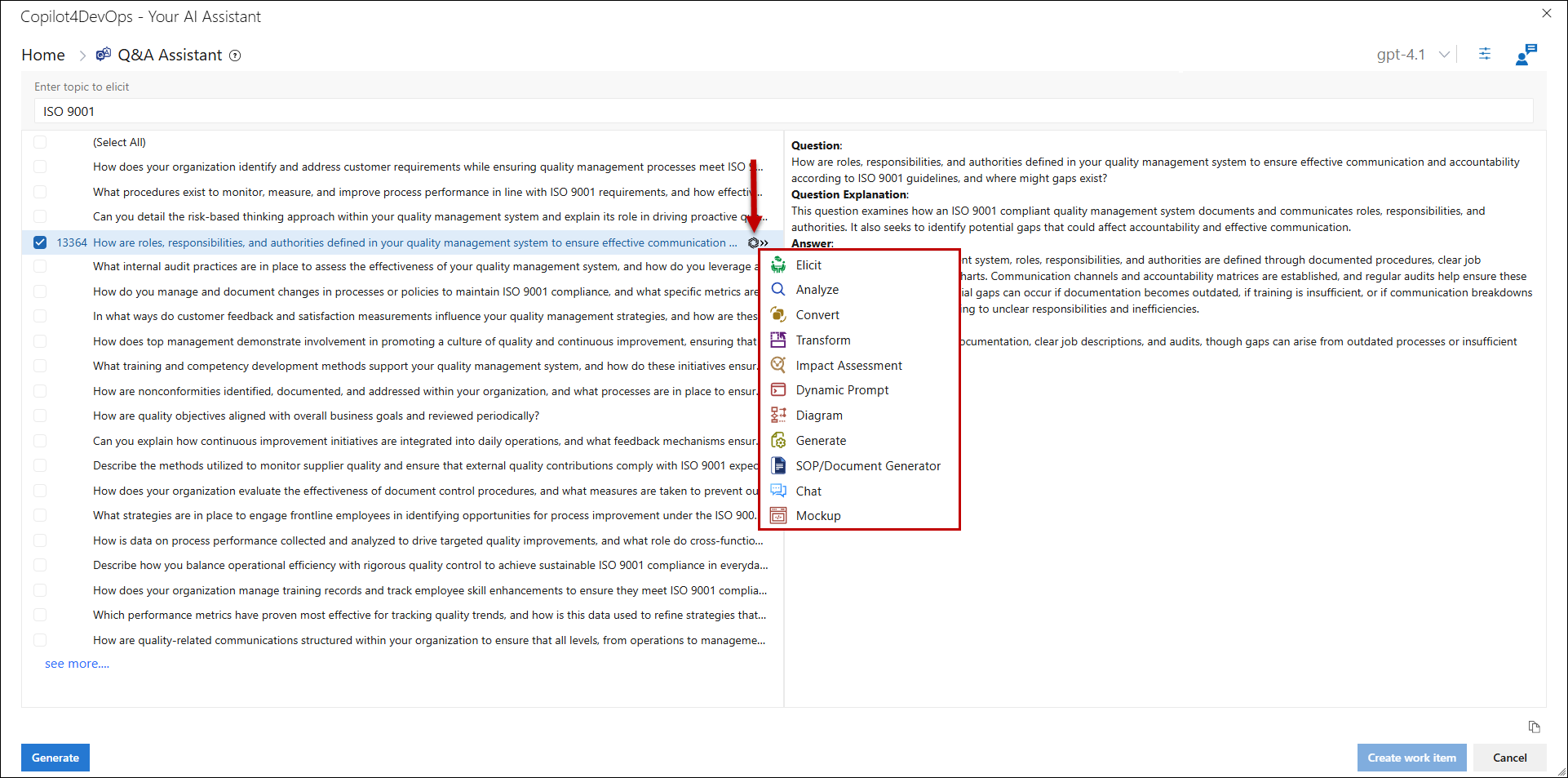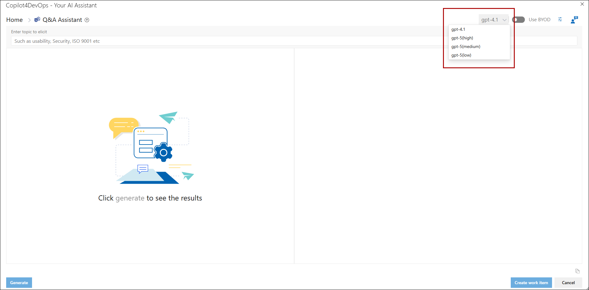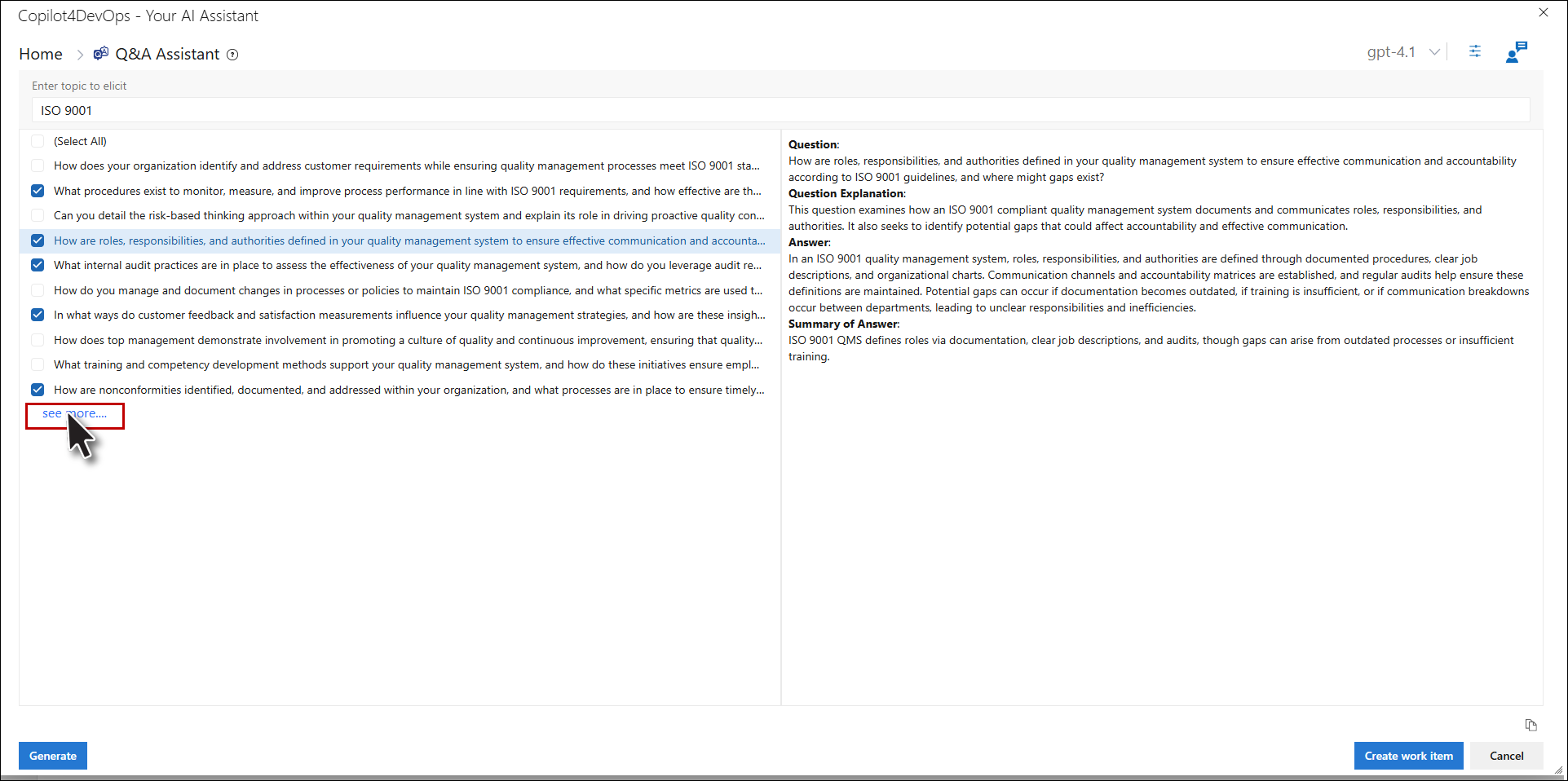 Note: This feature won't generate results based on the selected work item. Instead, you'll need to manually insert the topic to elicit and then questions related to the entered topic will be generated in the left panel.