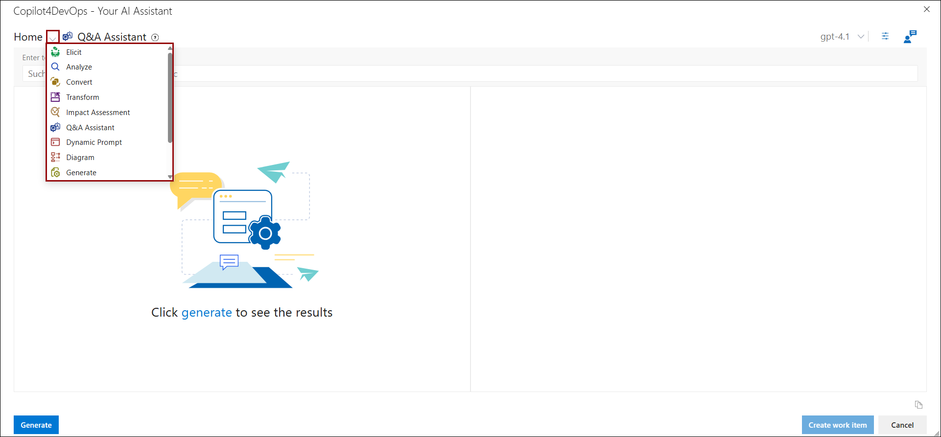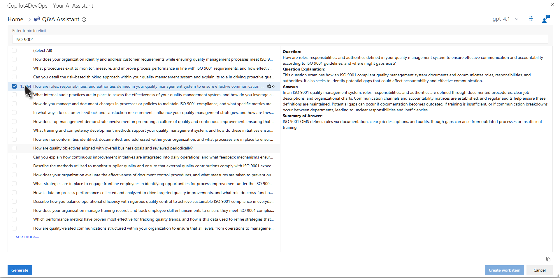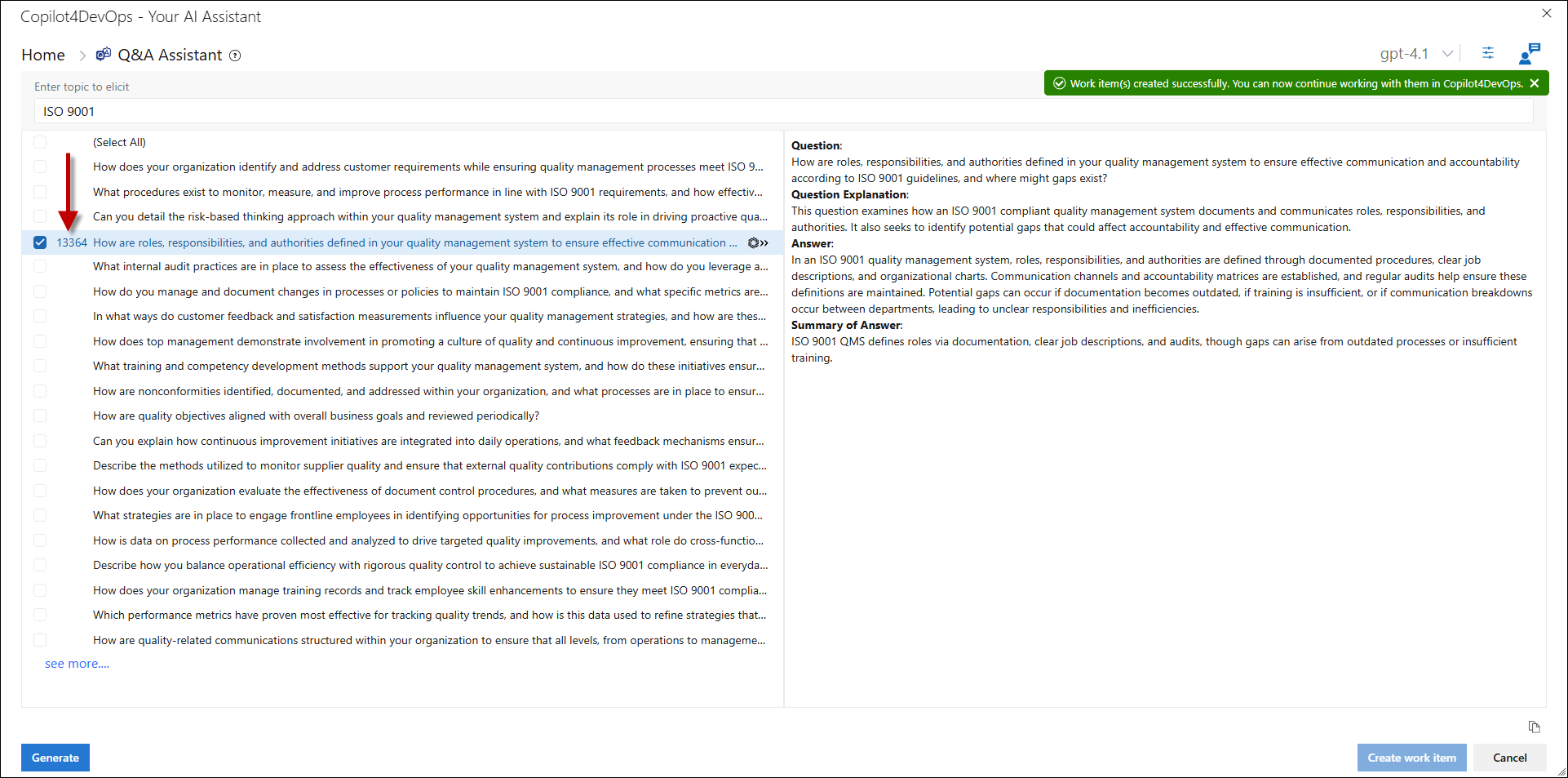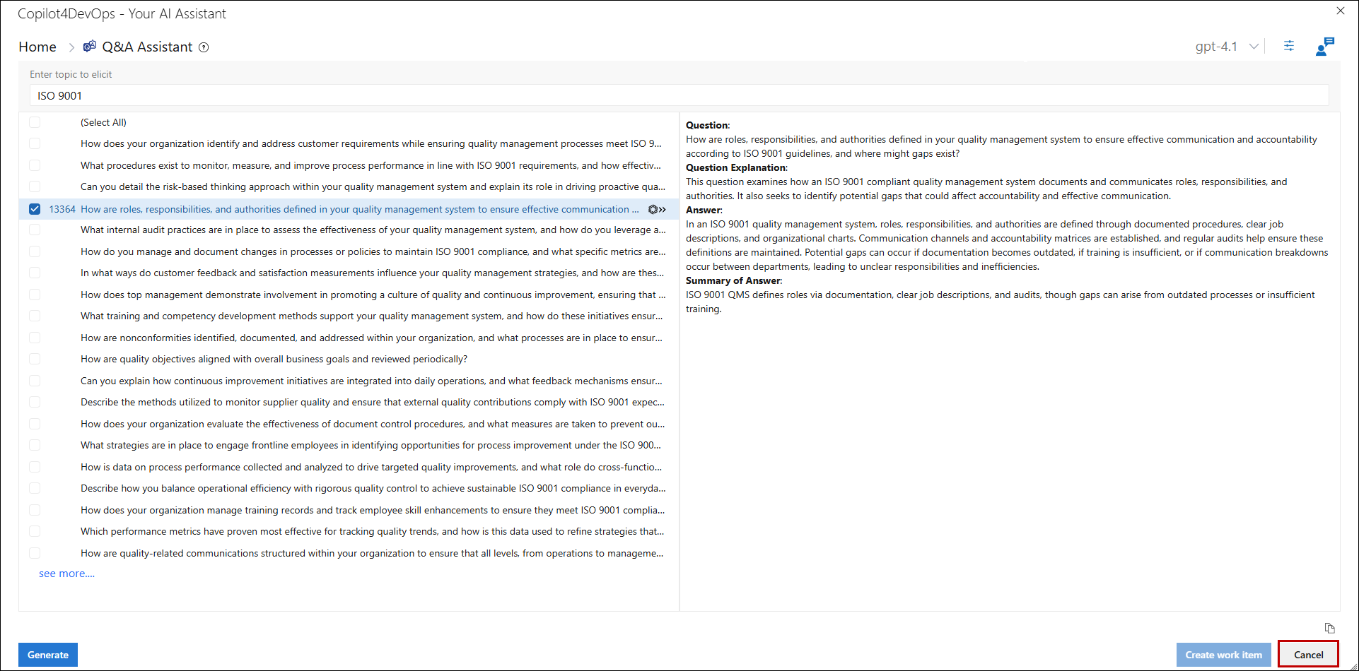 Note: This feature won't generate results based on the selected work item. Instead, you'll need to manually insert the topic to elicit and then questions related to the entered topic will be generated in the left panel.