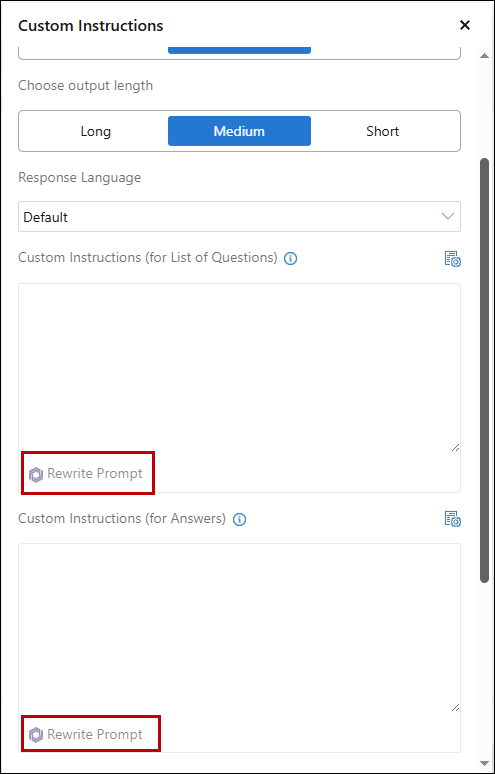 a. Users can rewrite their custom instructions using Rewrite Prompt option for both list of questions and answers in the Q&A Assistant function with a single click, producing structured, complete, and accurate instructions—using the AI model selected from the "AI Model Auto Selection and Ranking" section for “Rewrite Prompt” under the General tab in Admin panel.