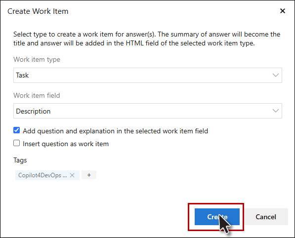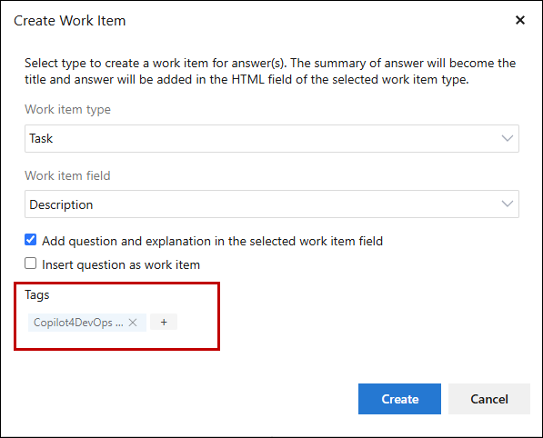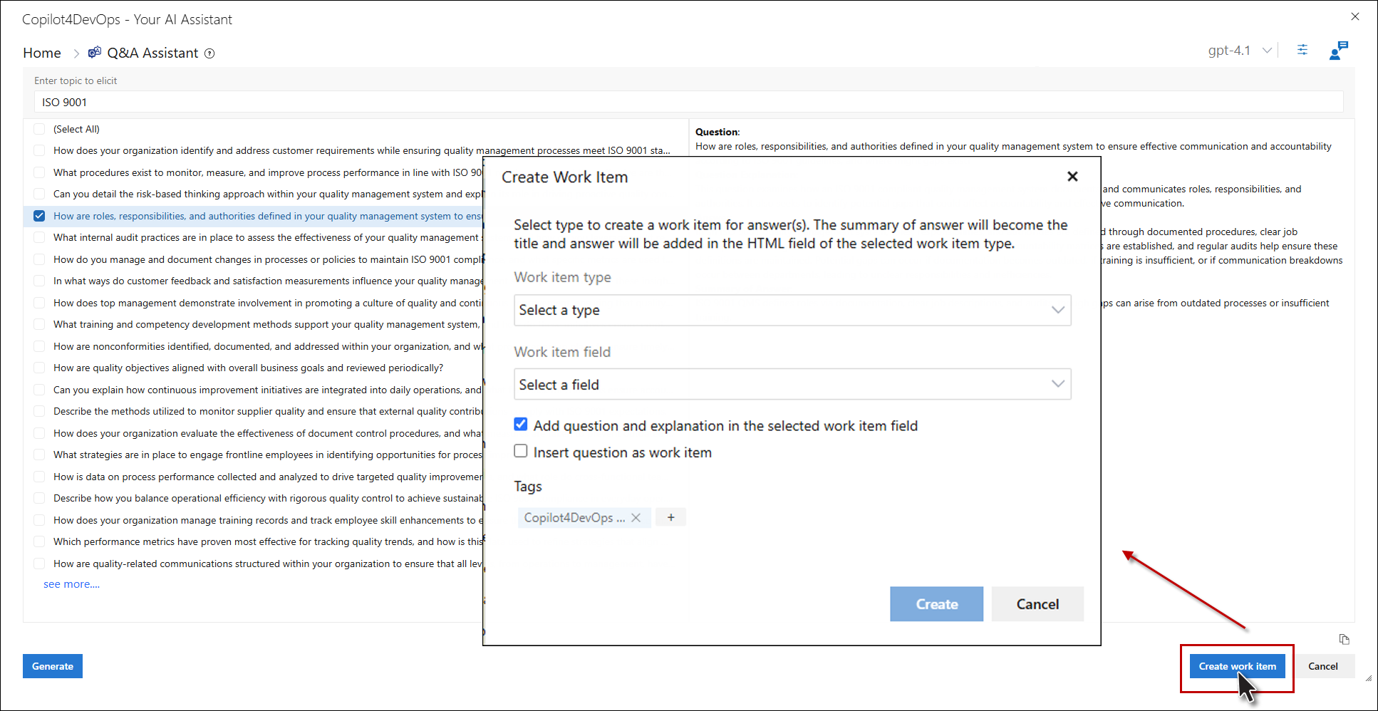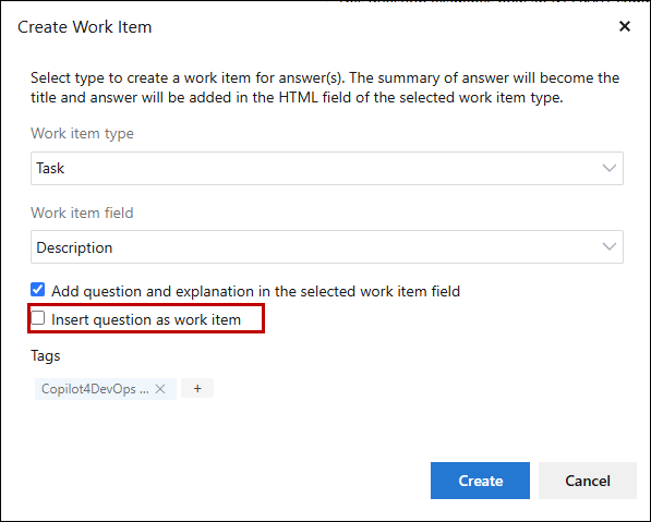 d. There is a checkbox labeled "Insert question as work item" in the pop-up. When selected, this checkbox disables the previously selected option, and the chosen question and its explanation will be added as a separate work item.