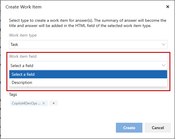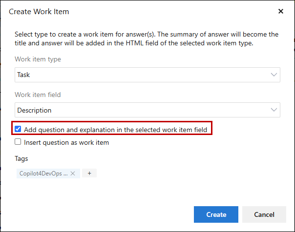 c. In the pop-up, there is a checkbox labeled "Add question and explanation to the selected work item field." By selecting this checkbox, the chosen question and its explanation will be added to the specified field of the published work item.