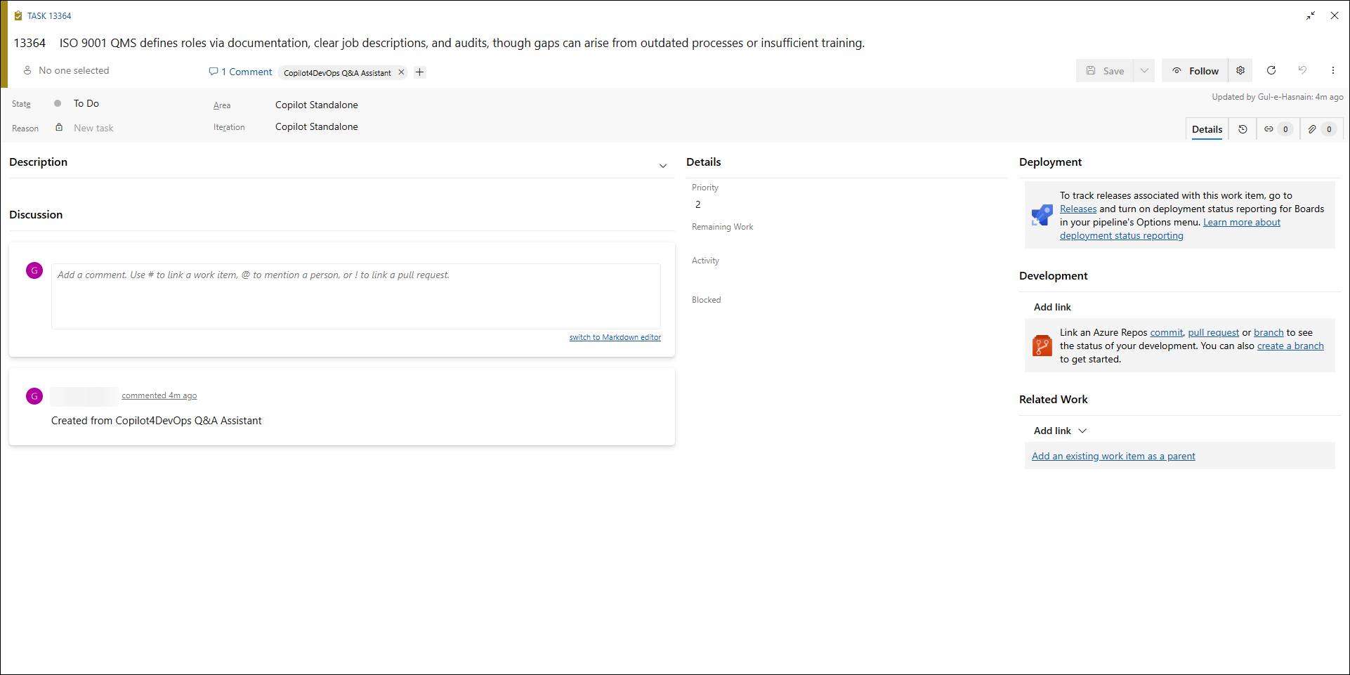 h. When a user hovers over a published work item row from the left panel, a Copilot4DevOps icon becomes visible. Clicking on this icon reveals a dropdown menu listing all other available Copilot4DevOps functions. The user can select any function from the dropdown, which will navigate them to the chosen function and allow them to perform their desired task.