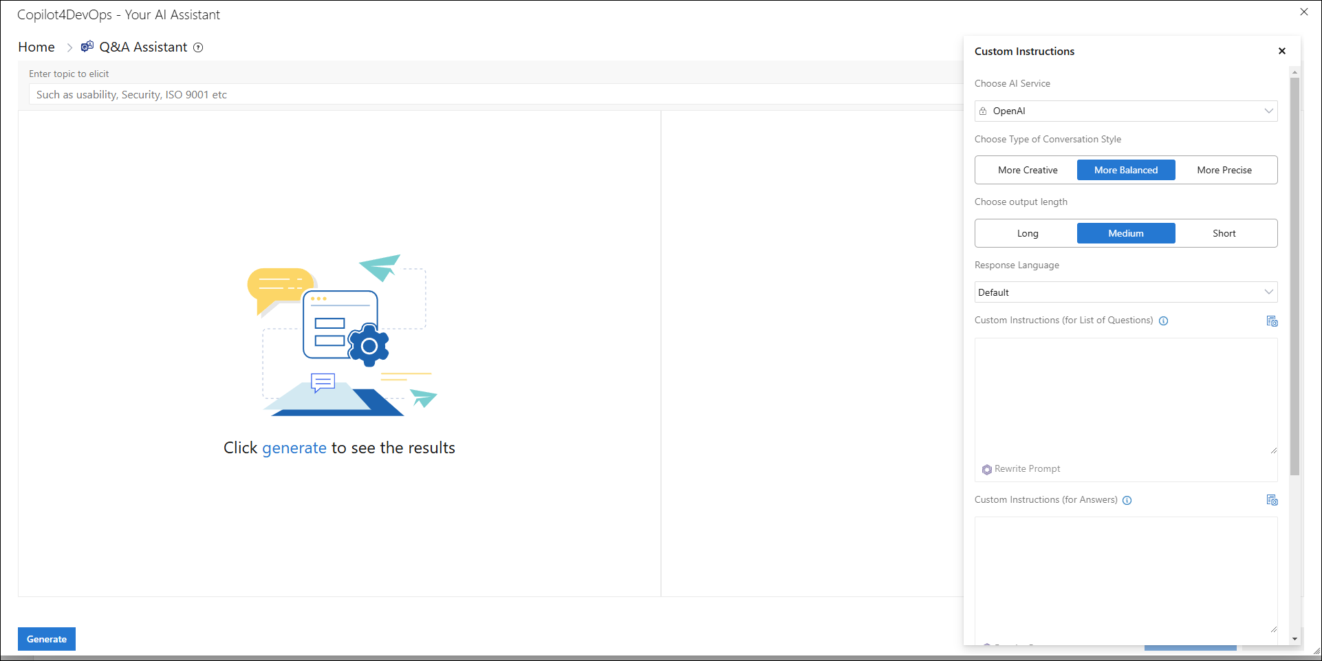 9. From the right panel user will be able to see the AI Service selected in the Admin also able to Choose Type of Conversation Style such as “More Creative”, “More Balanced” or “More Precise”. Furthermore, user can Choose Output Length such as “Long”, “Medium” or “Short”. Users also have the option to specify the Response Language and even include any Custom instructions which will be added with the default prompt for both list of questions and answers.