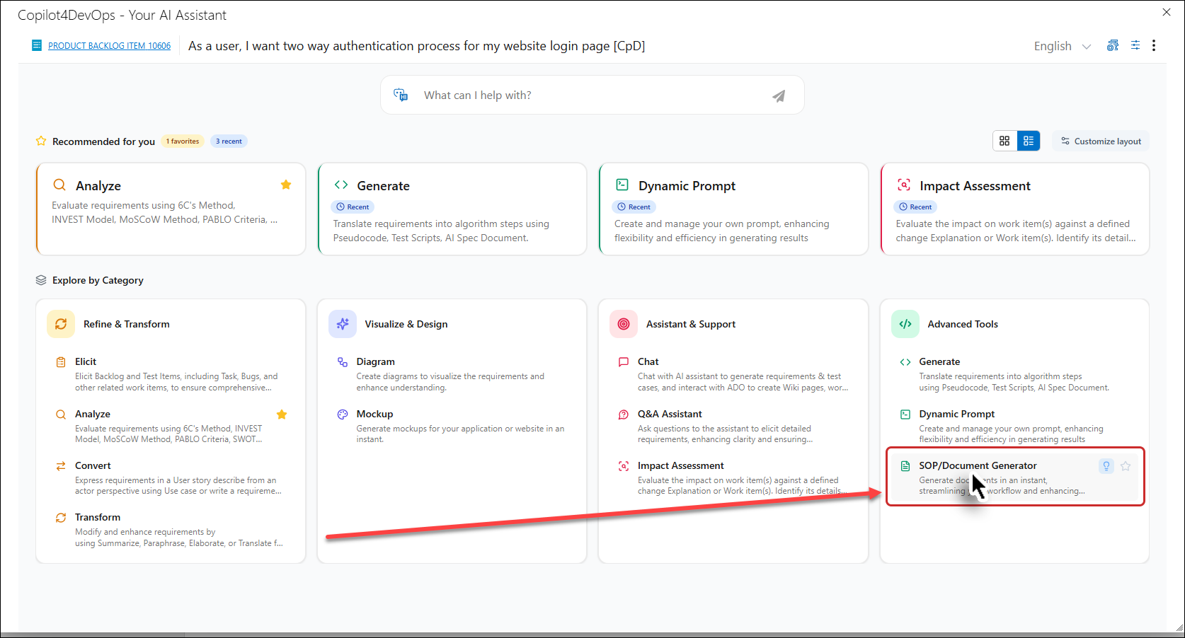 4. Once the Copilot4DevOps window is opened, you will find the SOP / Document Generator option. Click on this option to open the corresponding tool. The SOP / Document Generator is specifically designed to create relevant SOPs & Documents.