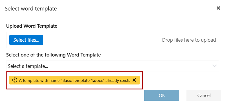 • If you try to upload a template with the same name as an already existing one, a popup will display: "This file name already exists."