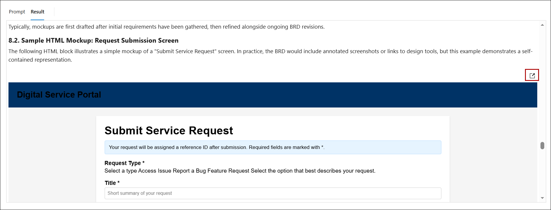 22. If the generated document includes a mockup, you can view it directly within the document or open it in a new tab by clicking this button.