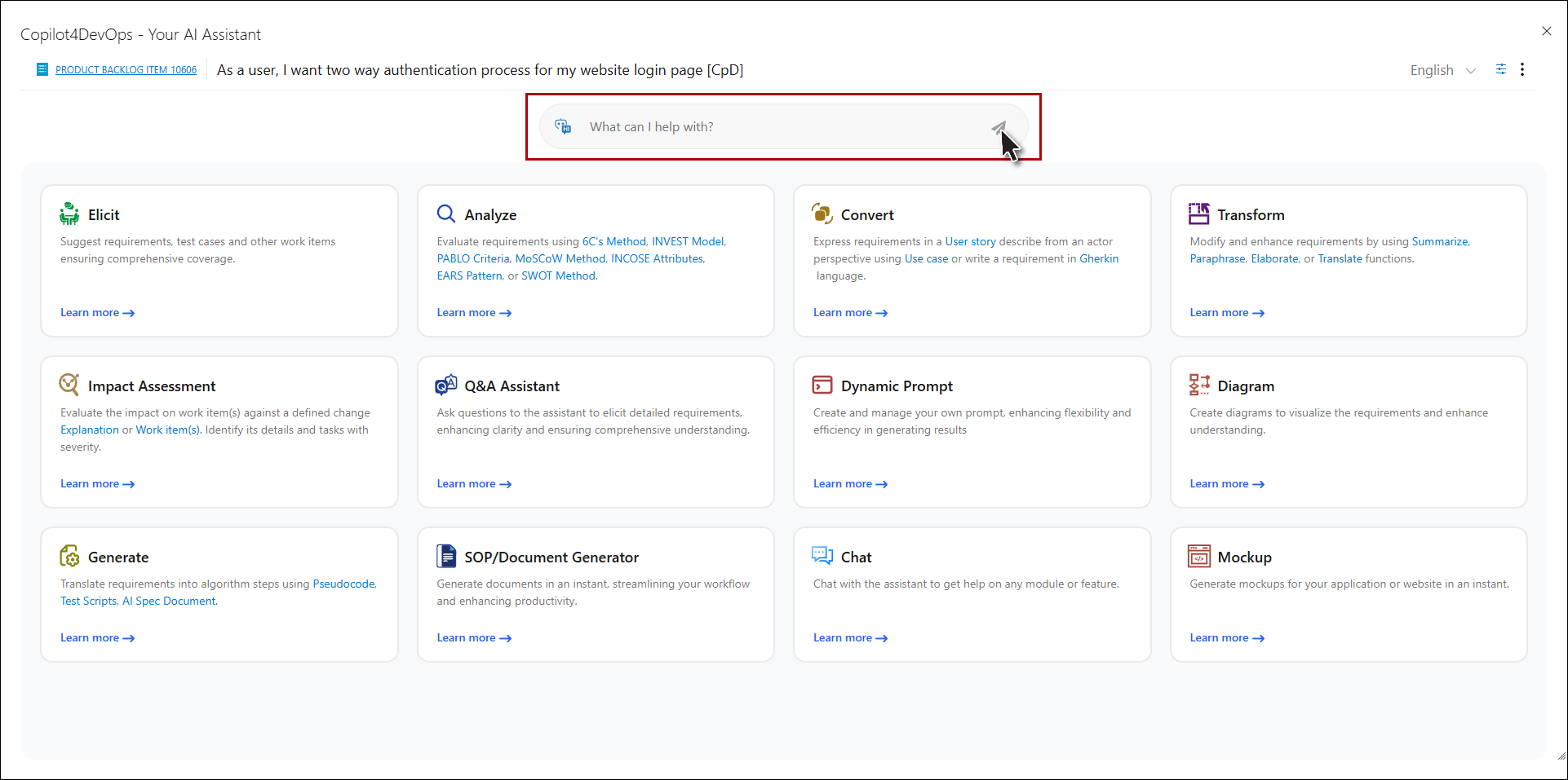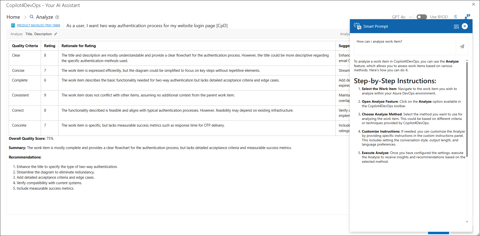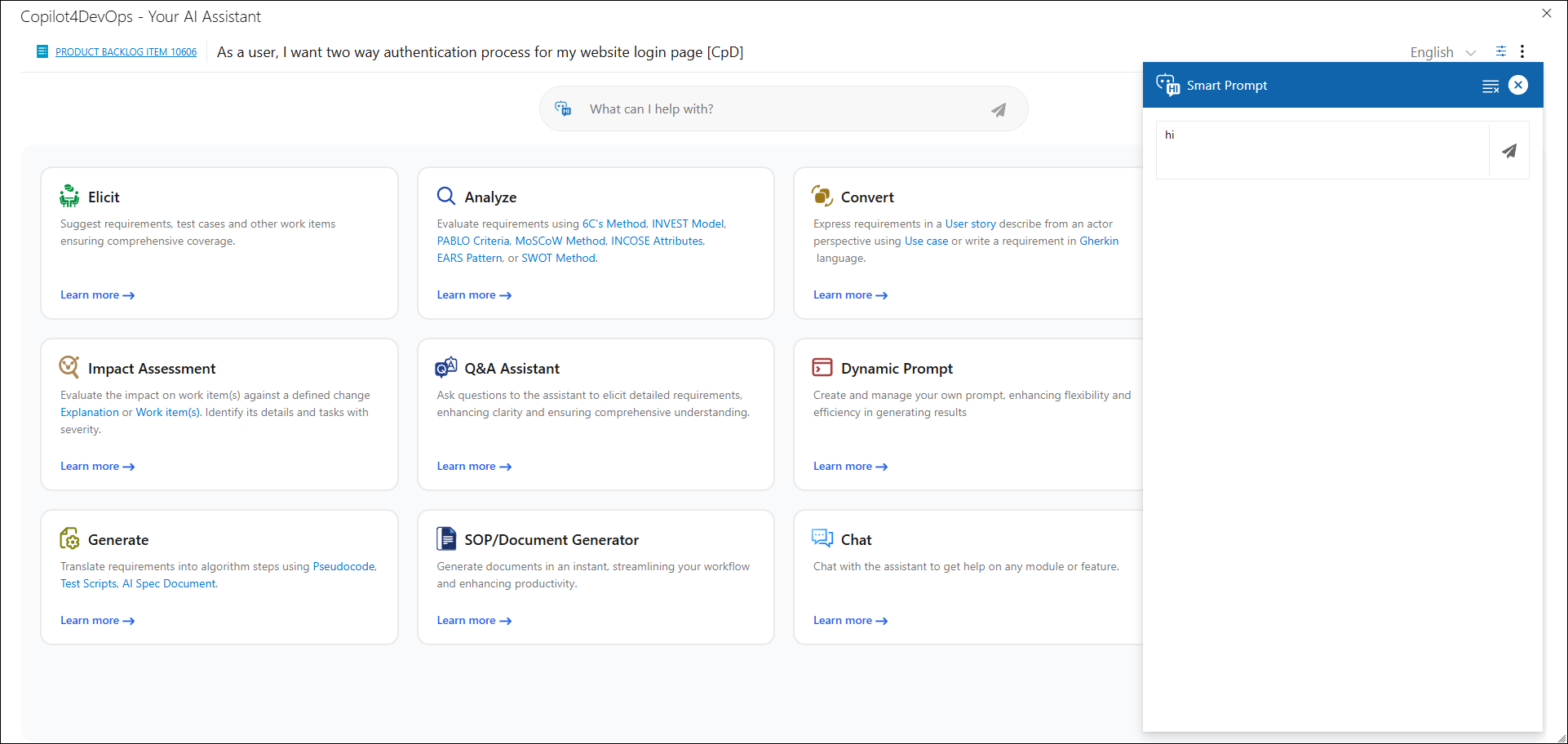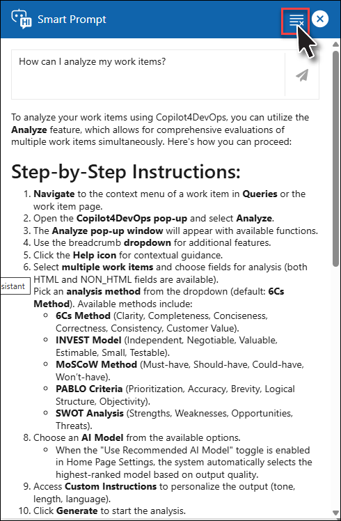User can ask their questions regarding Copilot4DevOps using Smart Prompt to get accurate responses, clear UI instructions, and tailored recommendations based on their queries.