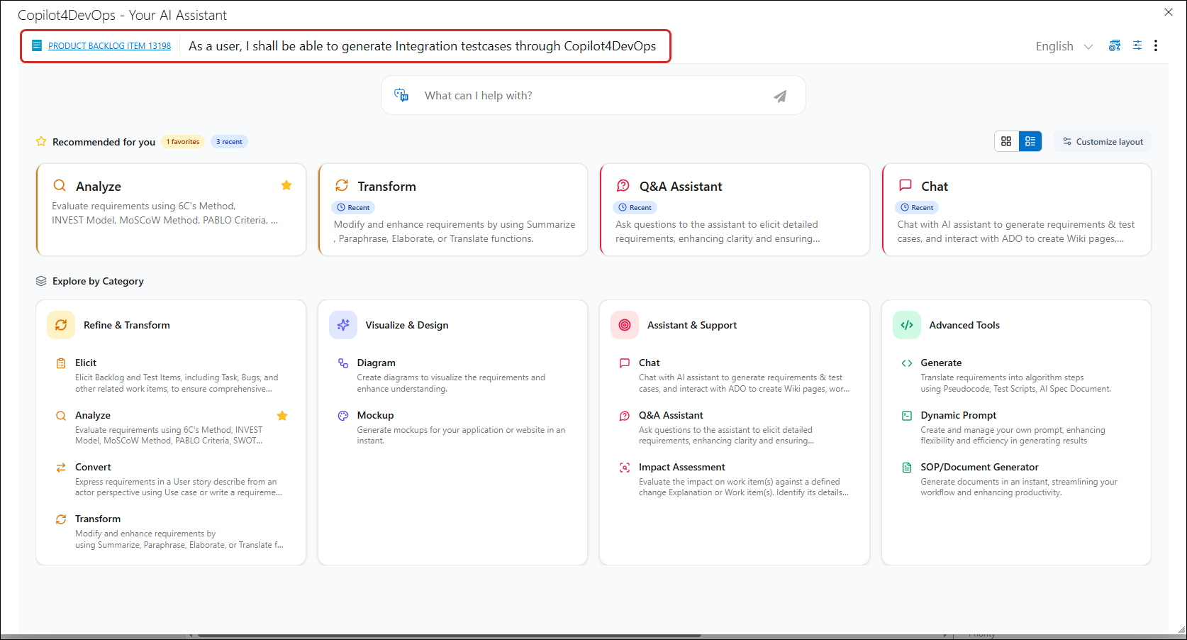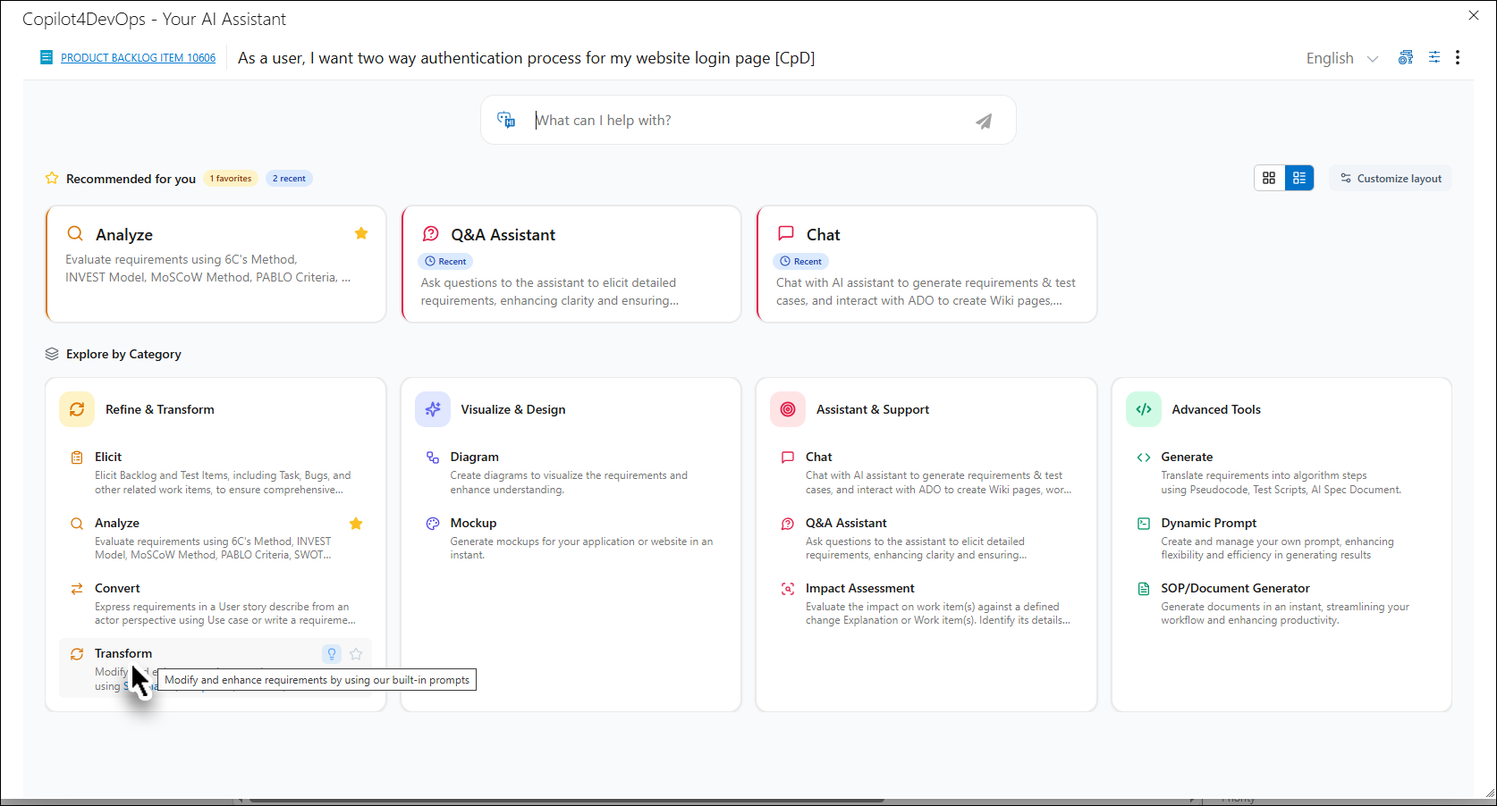 e. Clicking on the OK button after selecting at least one work item. It will update the details in the Transform function pop-up and home page of Copilot4DevOps with selected work item as the anchor for all functions.