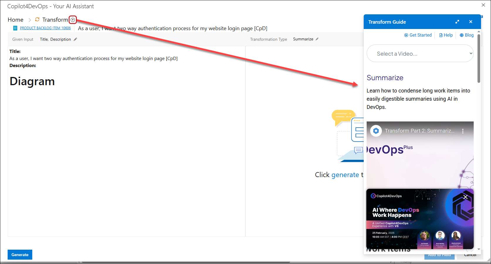 2. Copilot4DevOps pop-up appears. Click on the Transform function shown on the Copilot4DevOps popup.