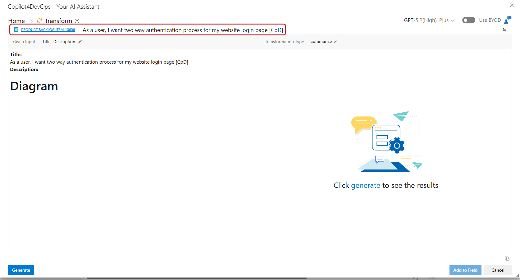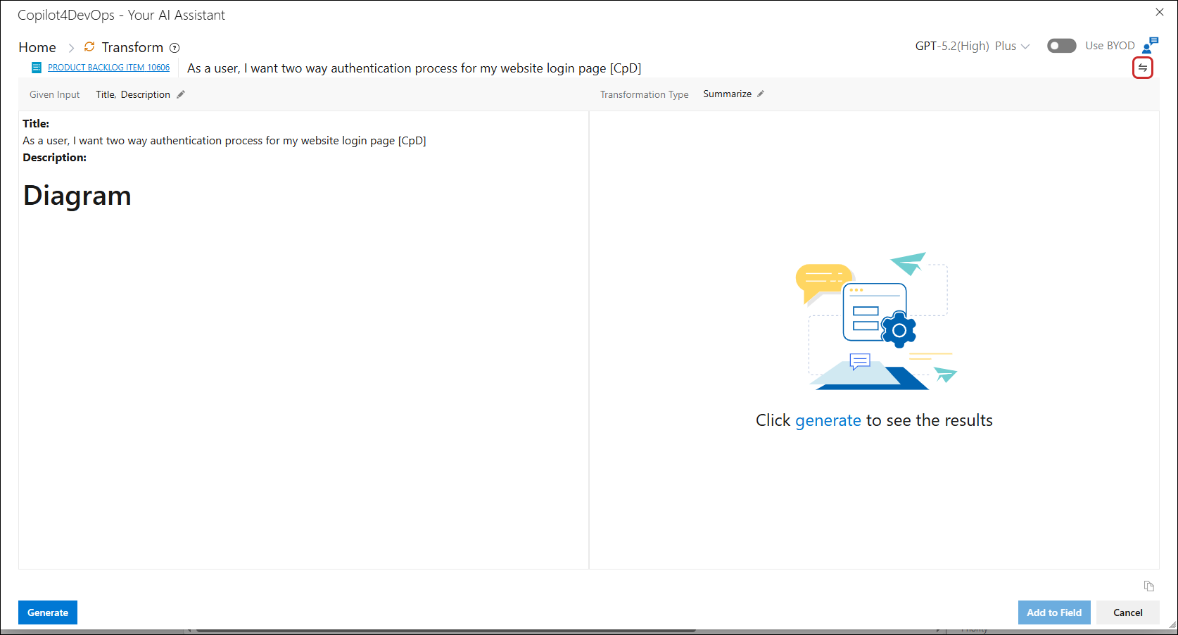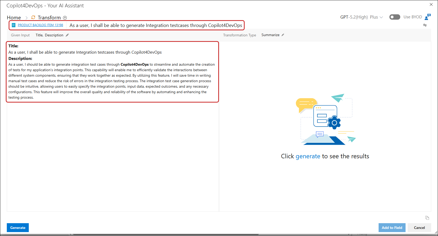 17. In case of Summarize, click on the Add to field button, a popup is opened, containing a work item field dropdown to select the work item field from the dropdown to add the generated result.
