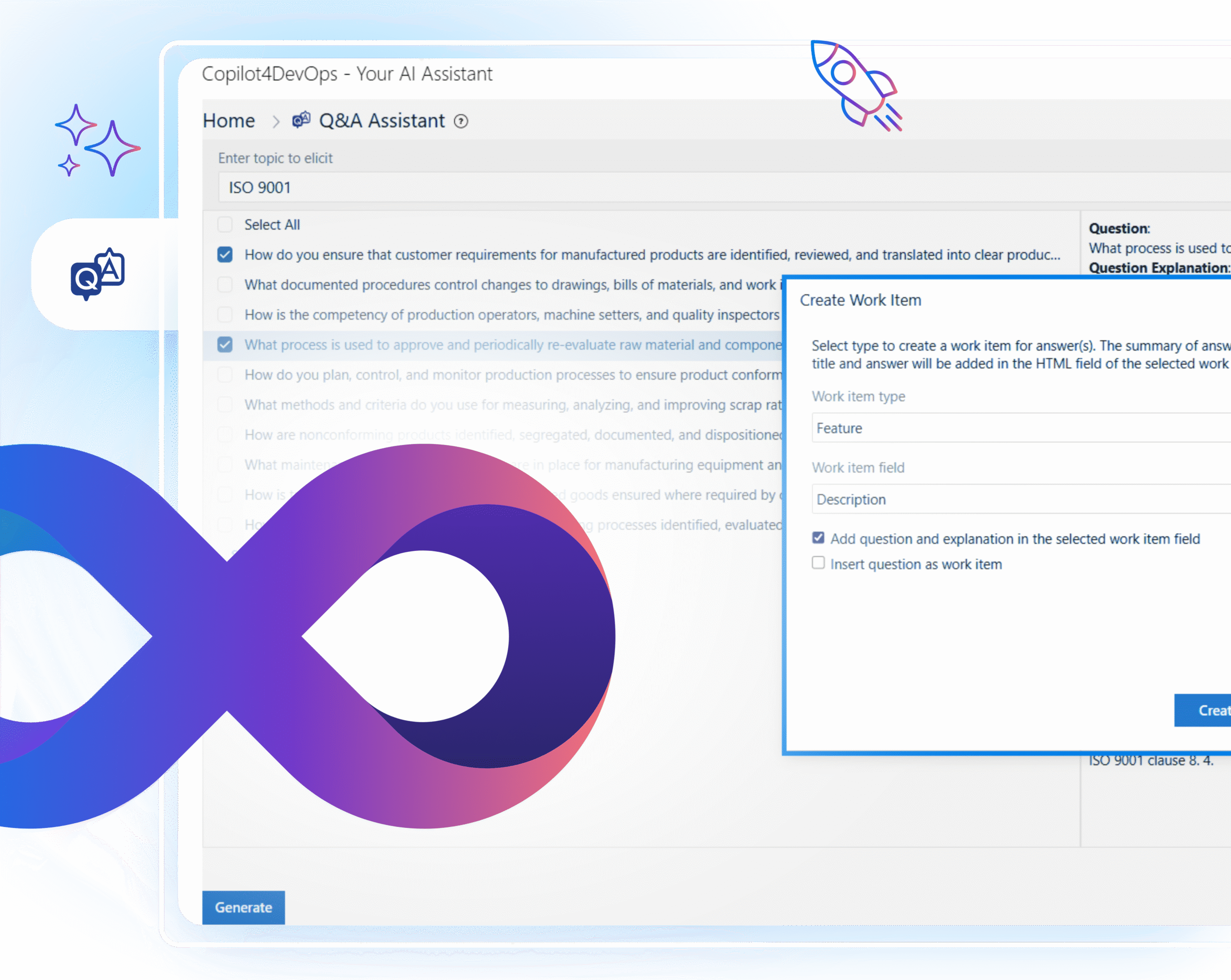 The Q&A Assistant in Copilot4DevOps helps teams get ready for project discussions with better questions. Enter a topic such as a feature, workflow, or compliance area, and AI prepares interview-style questions along with suggested answers. Each question comes with a short explanation and a concise answer summary. Teams can push generated questions to the Azure backlog as traceable work items.